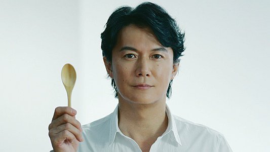 白いシャツを着た俳優の福山雅治さんが「スプーンで食べるサラダ。チョップドサラダ」と登場し、チョップドサラダを食べて「うん、なるほど」と言う、キューピーハーフのCMです。