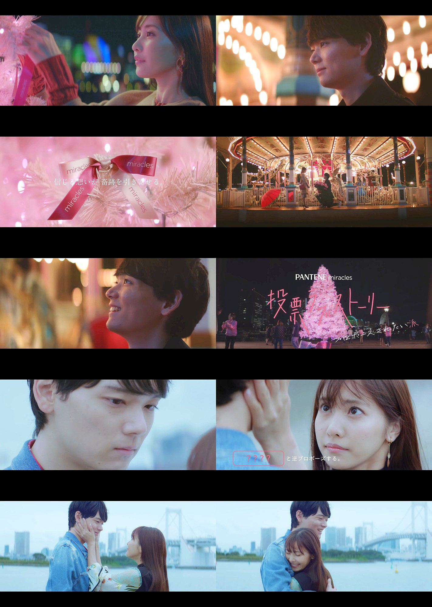彼氏役の俳優の古川雄輝さんと、彼女役の女優の佐野ひなこさんが、社内恋愛をするカップルになって、待ちくたびれた佐野ひなこさんが、深夜のメリーゴーランドの前で大量のバラの花束を手にした彼氏役の古川雄輝さんからプロポーズされる、パンテーン ミラクルズの長編CMです。