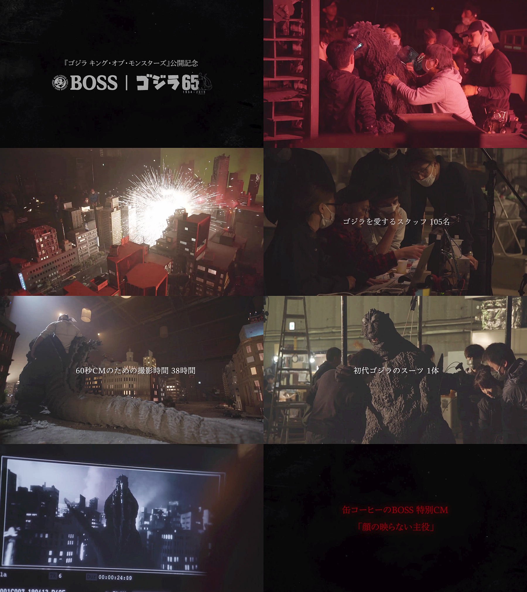 初代ゴジラのゴジラ俳優(ゴジラのスーツアクター)である中島春雄氏にフォーカスを当てた、東宝特撮ゴジラが登場する、ボスのCMの特報篇。CM撮影の特撮セットでゴジラが登場し、スタッフがミニチュアの建物をいじったり、ゴジラの着ぐるみのまま倒れるシーンなど、CMメイキングの映像を使って編集した、缶コーヒー ボスのCMです。