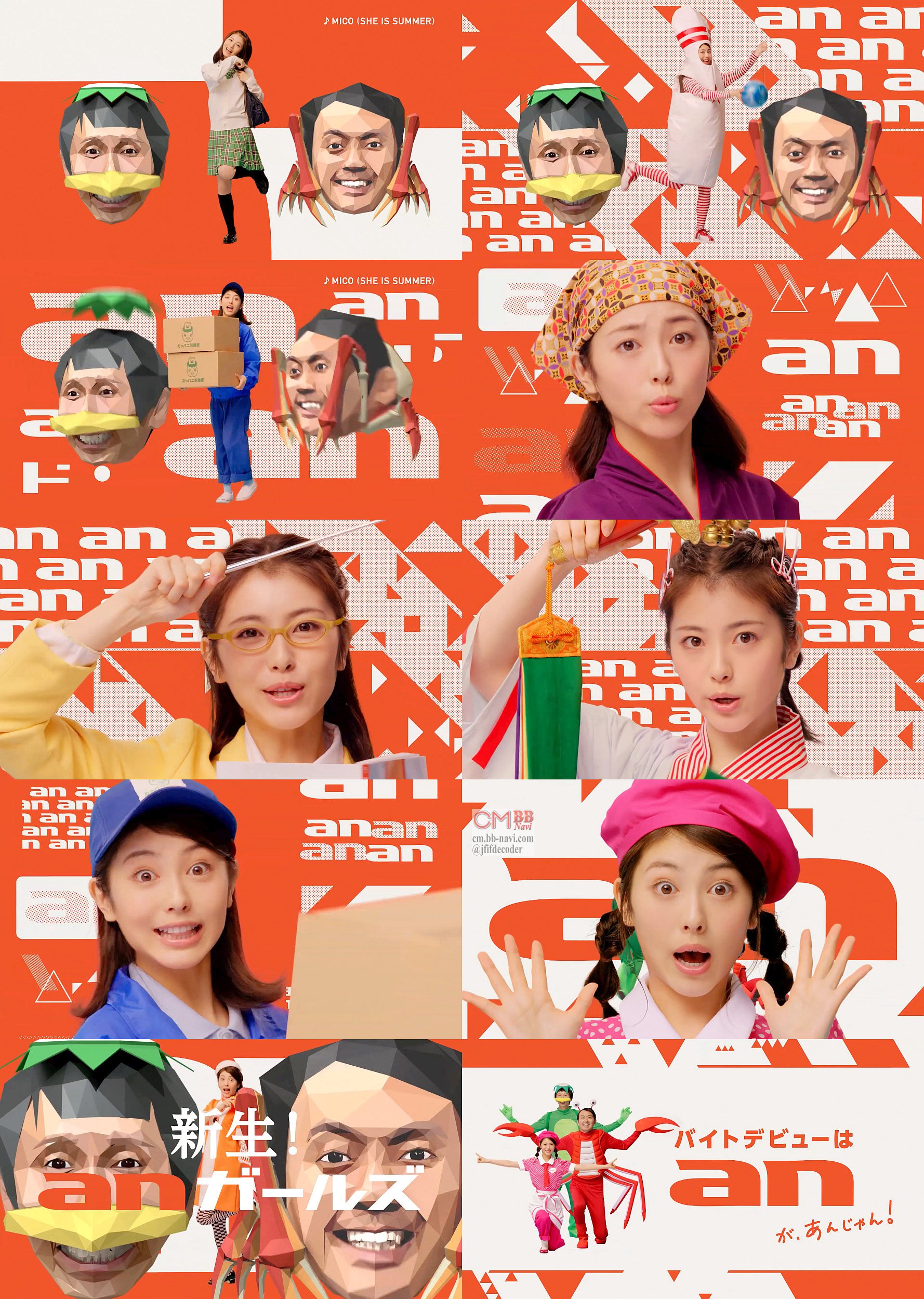 浜辺美波さんが「anがanじゃん♪」と女子高生やファミレスなどのバイトの衣装を七変化し、アンガールズの二人がカニとカッパの新生アンガールズで登場して、ショートコントをする多分ウェブ限定のPERSOL anのCM 12秒版。