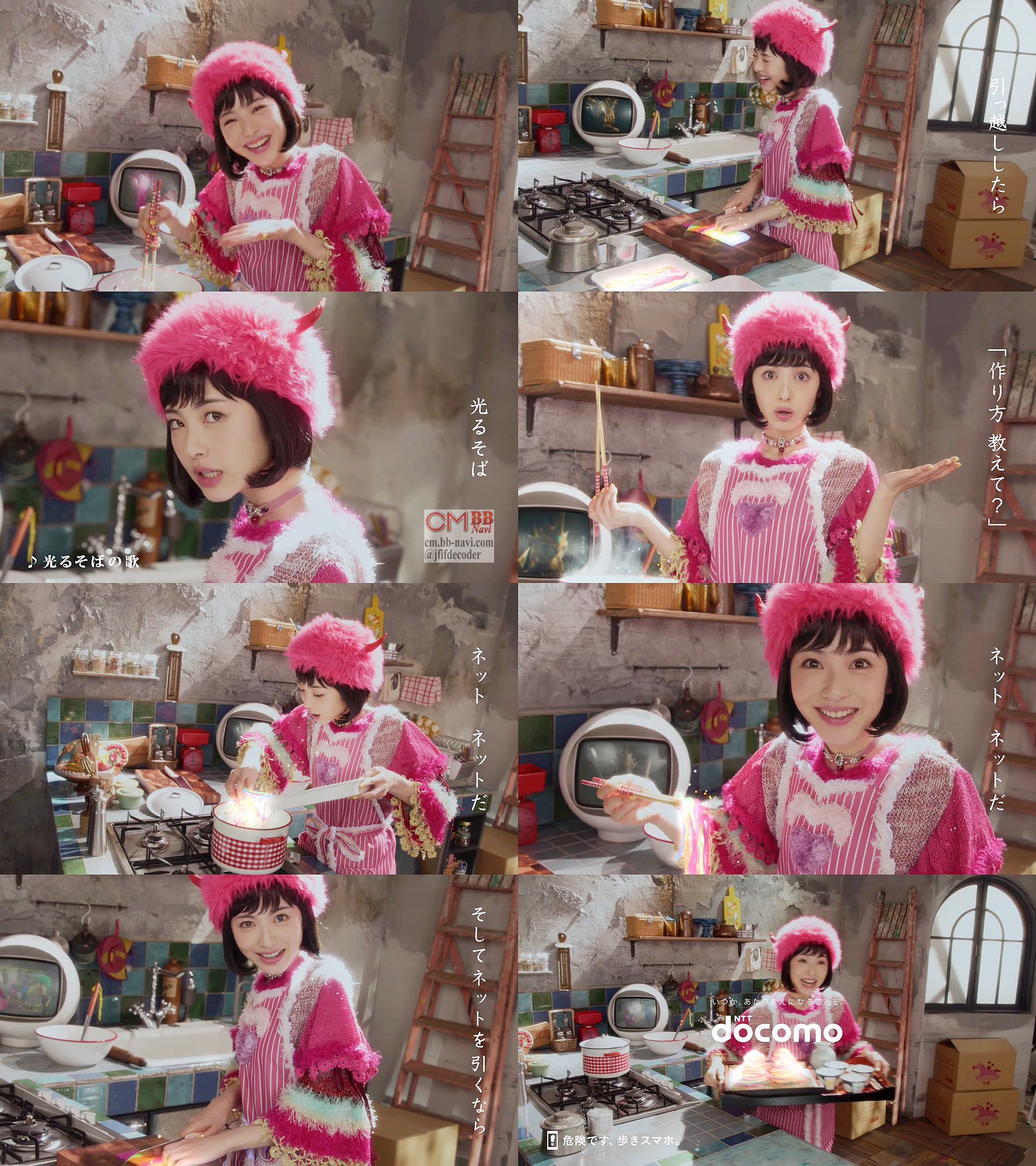「光る〜 光るぜ 光るそば 引っ越ししたら、光るそば♪」のCM曲と共に、モンジュウロ役の浜辺美波さんがキッチンで光るそば料理しながら歌って登場し、「作り方教えて」と聞くと「ネット、ネットだ〜♪」と歌が答え、浜辺美波さんが出来上がった料理を「光るそばだよ〜」と嬉しそうに運ぶ、ドコモ光のCM 30秒版です。
