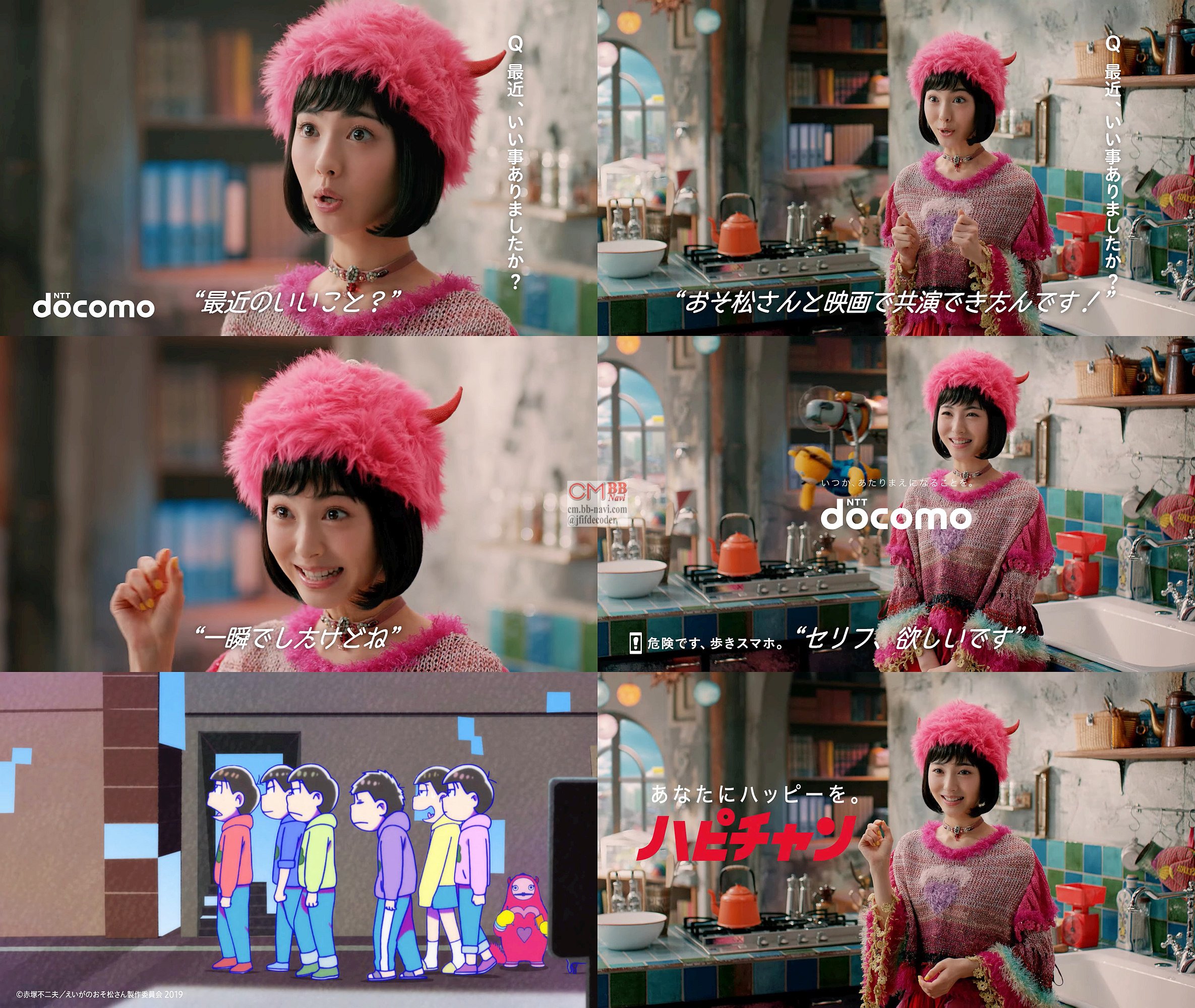 モンジュウロウ役の女優の浜辺美波さんが、最近のいい事で「おそ松さんと、映画で共演できたんです」「一瞬でしたけどね」と答え、「セリフ、欲しいです」と言うドコモのハピチャンのCM。