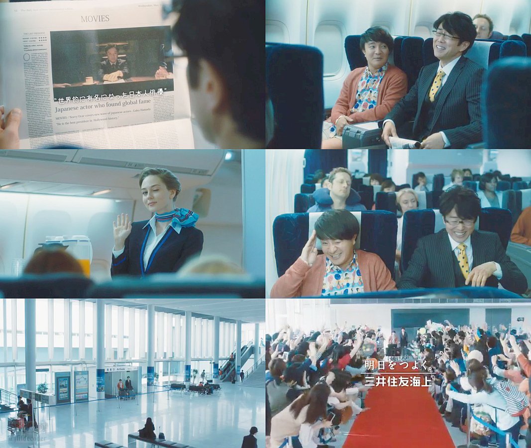 ジェット機の中でも外人の美人CAからもウィンクされるほどに、大統領役を演じてすっかりハリウッドスターの人気者になった俳優の濱田岳(GAKU HAMADA)さんが、マネージャーに空港が「ファンで溢れかえってんじゃないの?」と冷やかされ、日本に帰国すると、空港には誰もおらず、がっかりしてマネージャーに「明日があるぜぇ」と励まされ、そのまま進むと、ロビーには赤絨毯が引かれ、溢れかえるほどの大勢のファンが一斉に「おかえりー」と出迎えている、三井住友海上 MS&ADのCMです。