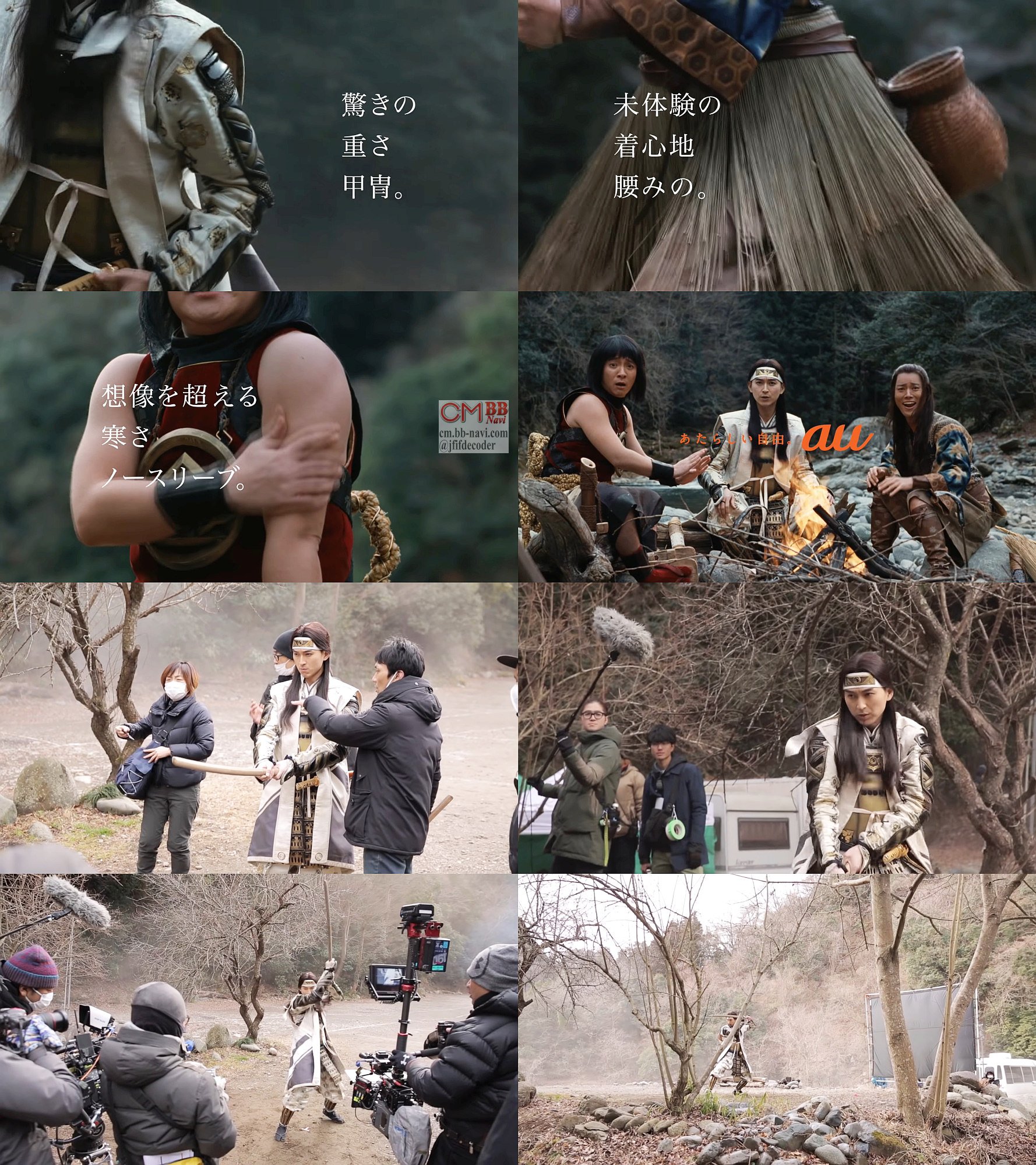 三太郎の、桃ちゃん役の松田翔太さんが「驚きの重さ。甲冑」と、木刀を振って登場し、浦ちゃん役の桐谷健太さんが「未体験の着心地。腰みの」と、川釣りをしながら登場し、金ちゃん役の濱田岳さんが「想像を超える寒さ。ノースリーブ」と腕を寒そうにさすって登場し、「三太郎の日で、快適インナー貰える」のナレーションに三太郎の3人が声を揃えて「え? ありがたーい」と言う、auのCM 30秒版です。