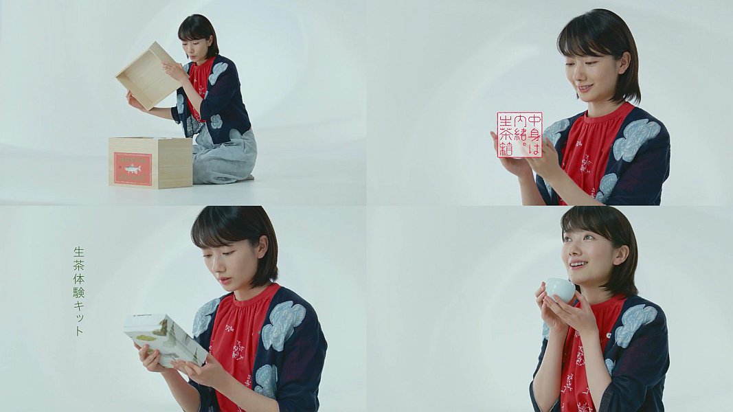 大きな白の花柄の紺のカーディガンを着た女優の波瑠さんが、正座して桐の箱(生茶箱)を開け、中に入っていた秘密の物を手に取り「おぉ」「へぇ〜」「なんだ」「かわいい」と言う生茶箱プレゼント告知の、キリン生茶のCMです。