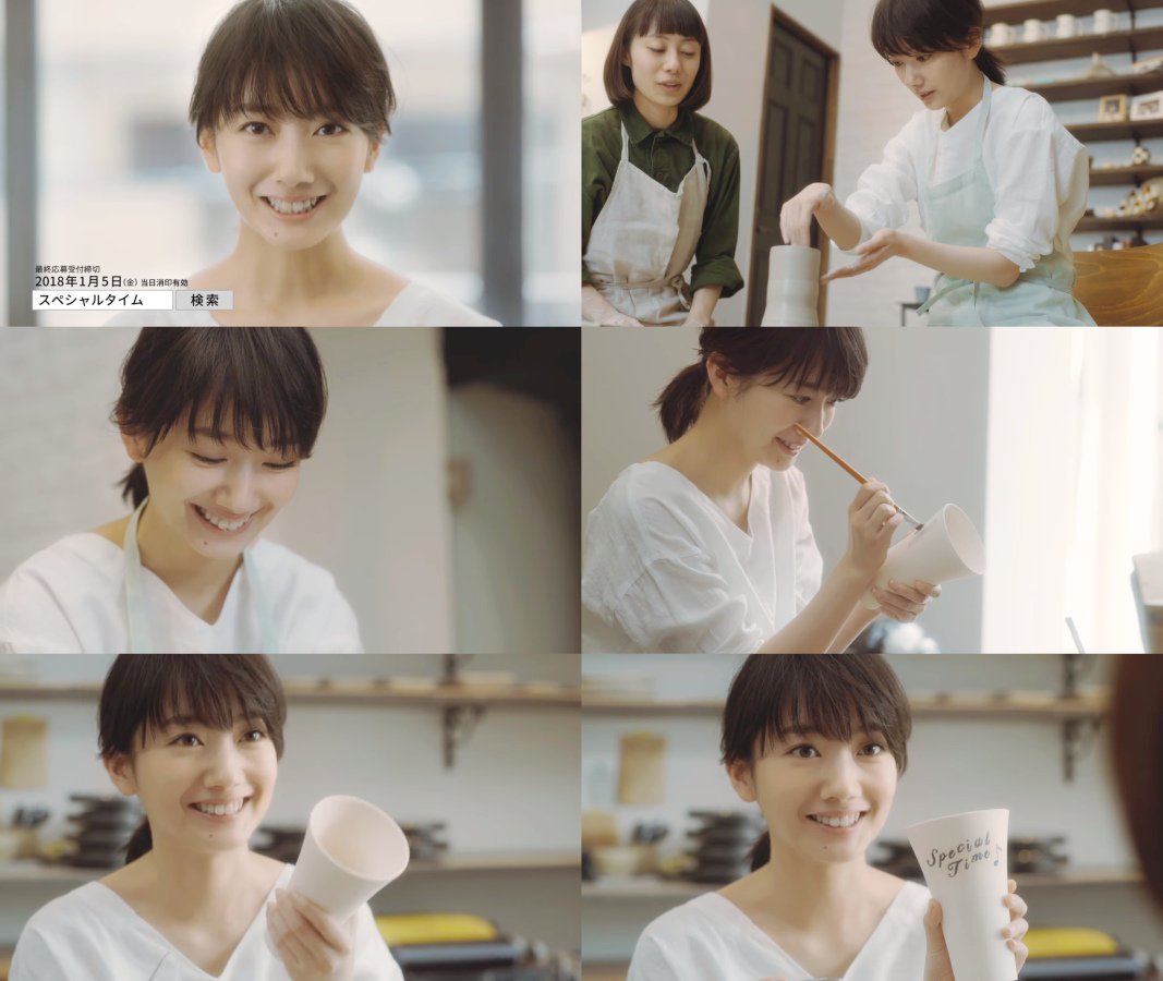 髪を後ろにまとめた女優の波瑠さんが、陶芸教室にやってきて、電動ろくろを使い、Special Timeのロゴの入った、波瑠デザインの、ビアマグ(特製美濃焼タンブラー)を先生に助けられながら作って、このタンブラーが必ず貰えるプレゼントの告知をして「応募、早く早く」と言う、CMです。