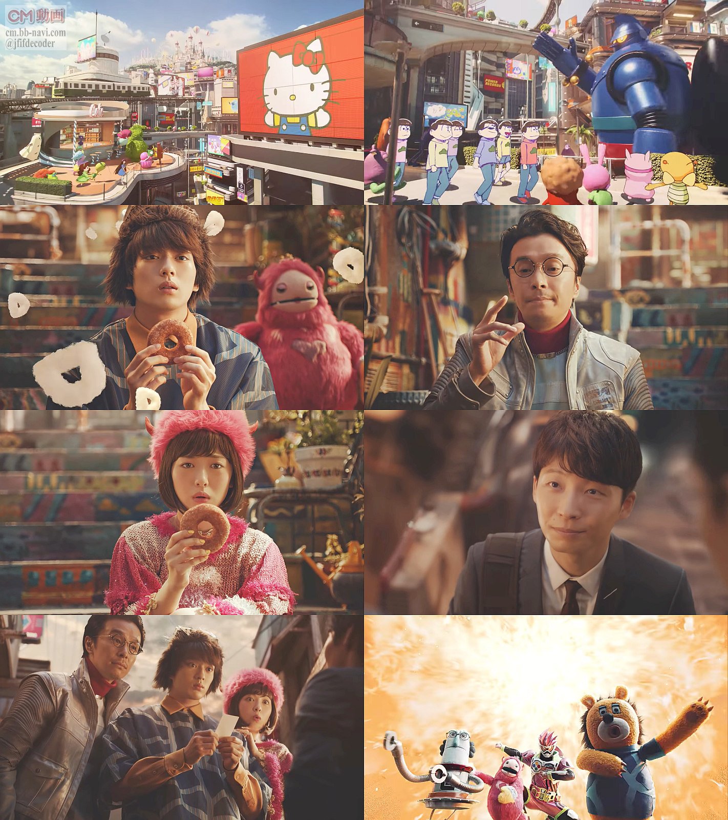 キティちゃん,おそ松さん,鉄人28号など色々な人気者のキャラクターがいる世界”キャラまち”の片隅のイヤミ劇場で、全く人気が出ず、イヤミにクビにされたマペット、新田真剣佑さん演じるドニマル,谷川博己さん演じるコスモフ.,浜辺美波さん演じるモンジュウロウの3匹が、夕暮れ時に途方に暮れているところへ、プロデューサー星あゆむ役の俳優の星野源さんがやってきて名刺を出して、4人が出会うドコモのCM、長編1分版です。