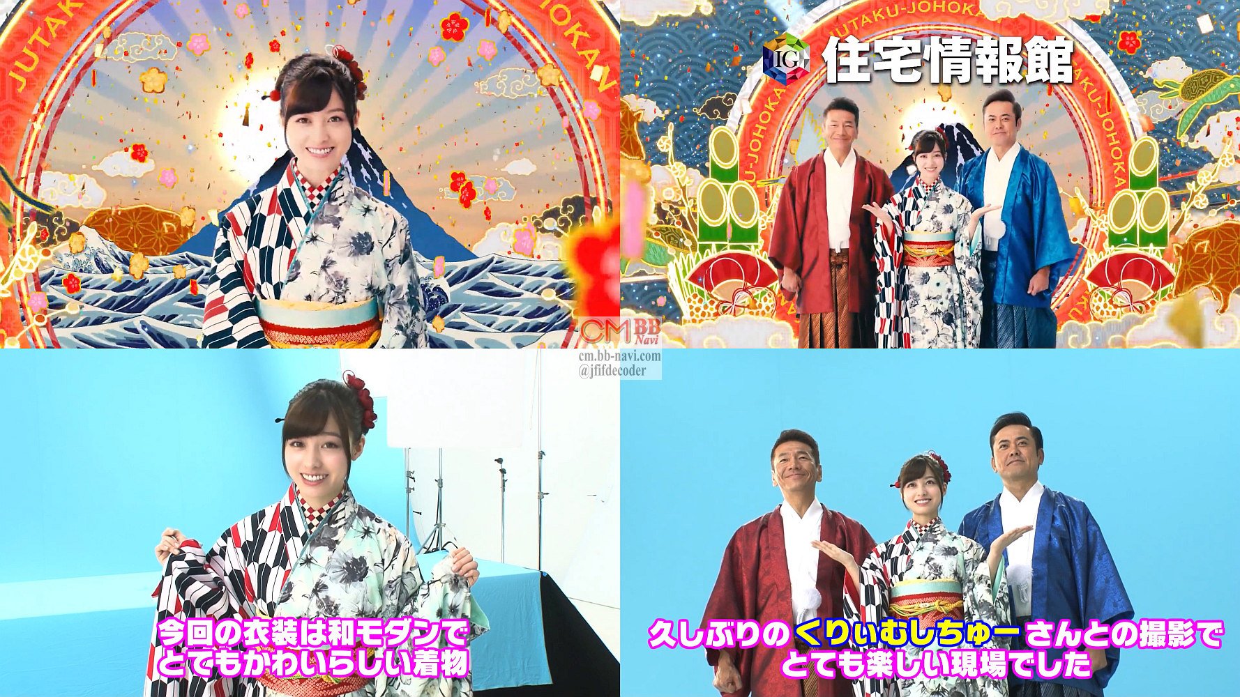 紋付き袴姿のくりぃむしちゅーの2人と片身替わり風の着物を着た女優の橋本環奈さんが新年の挨拶をする住宅情報館のCMのメイキング動画。