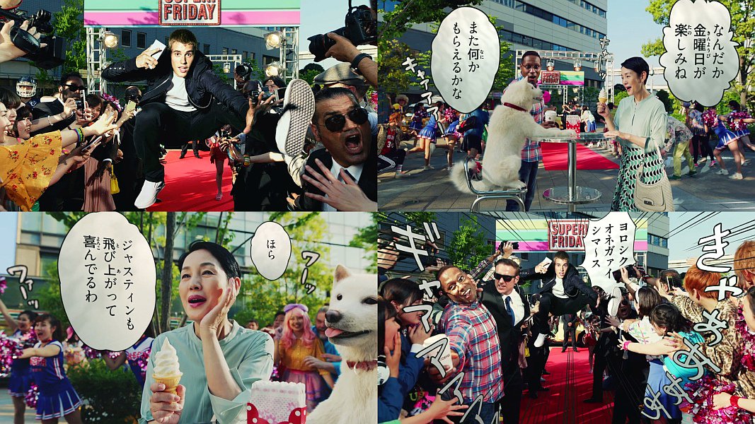 白戸家の樋口可南子,ダンテ・カーヴァー,ジャスティン・ビーバー,犬(お父さん)が、ストップモーションで出演し、スーパーフライデーの事を話題にし、「ほら、ジャスティンも飛び上がって喜んでるわ」と吹き出しで言う、ソフトバンクのCM動画です。