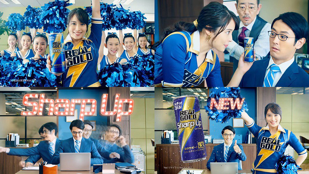 周りが気になってオフィスで仕事に集中できない男性サラリーマンの前に、女優の広瀬アリスさんが青の衣装のミニスカのチアリーダーになって、「集中できない? 集中サポート、シャープアップ」と登場しシャープアップを渡すと、サラリーマンが人が変わったかのように仕事をバリバリとこなす、リアルゴールドシャープアップのCMです。