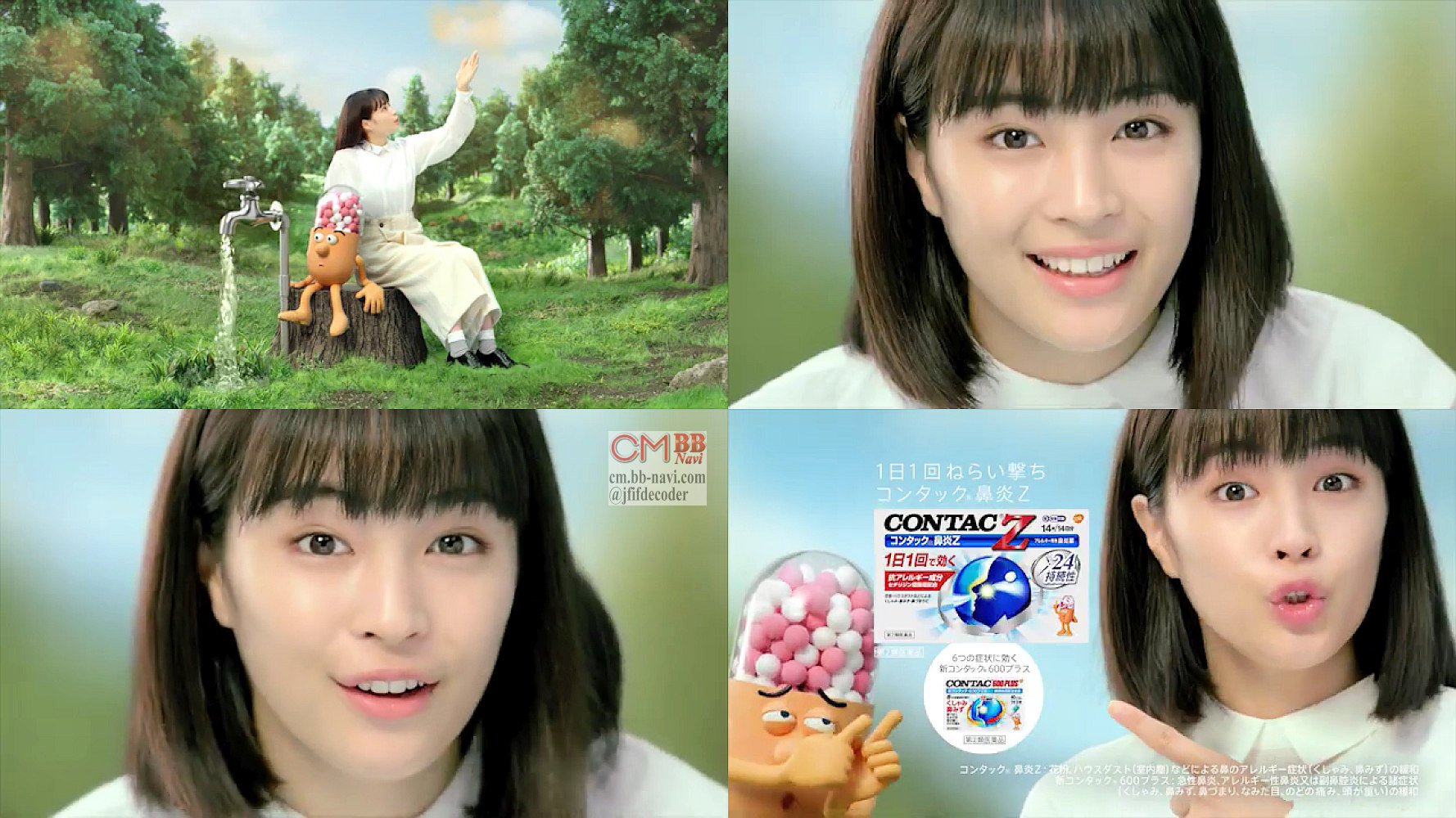白のワンピース姿のボブカットの髪型の女優の広瀬すず さんが、森の切り株の上に腰かけ、「今日も花粉飛んでるけど、鼻水、止めたいよね」と言うと、コンタックの錠剤のキャラクターミスターコンタ君が「ハイ、すずちゃん」と言って、蛇口の栓を「キュー」とひねって流水を止め、広瀬すず さんが「どう?」と問いかけ、最後は二人で「キュー」と言います。