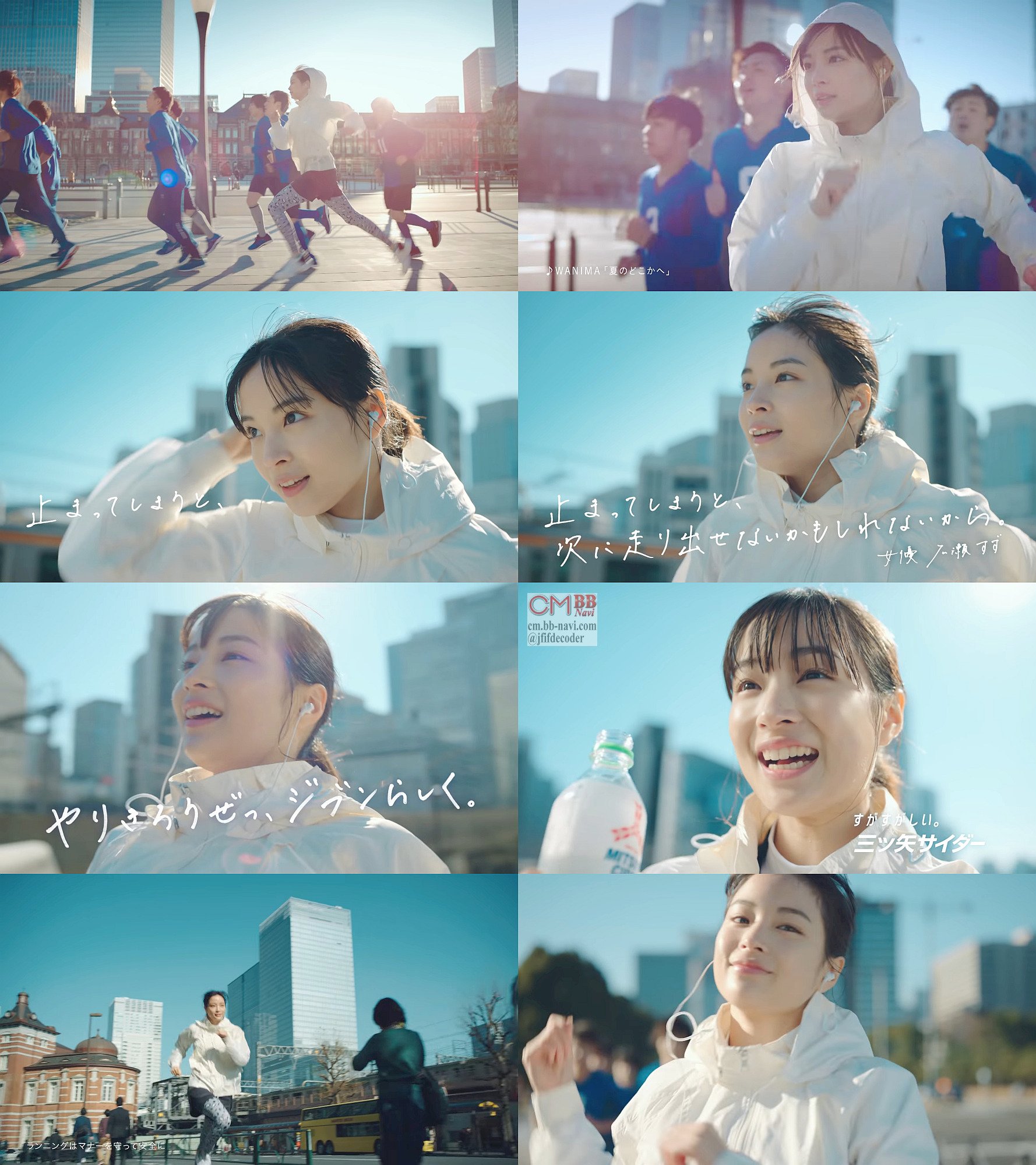 女優の広瀬すずさんが白いパーカーを着たポニーテールの髪型で、東京駅の前などをランニングしながら、「止まってしまうと、次に走り出せないかもしれないから」と、息を上げ休憩し、「やりきろうぜっジブンらしく」と言う、三ツ矢サイダーのCM 。