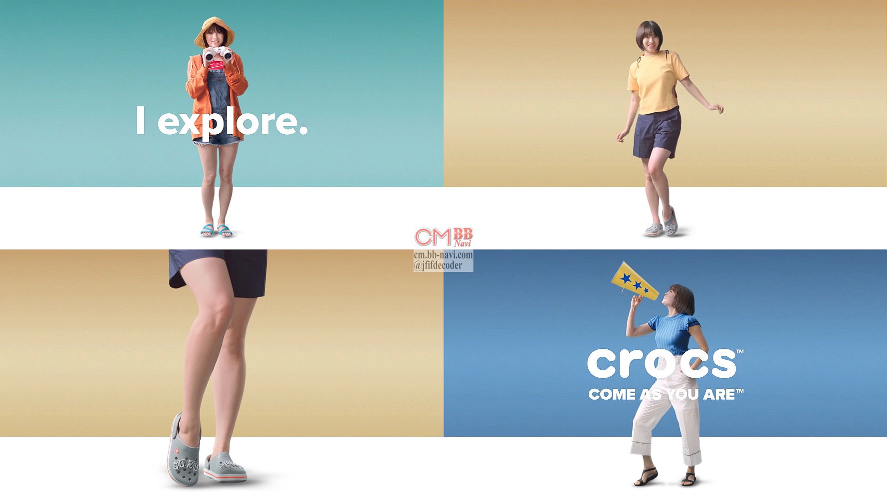 広瀬すずさんは、カジュアルな短パンの服装で「日常に色を足そう」 オレンジのパーカーに生足の短パンで帽子を被り双眼鏡を手に「冒険する」 最後はメガホンを手にポージングして「クロックス」と登場します。