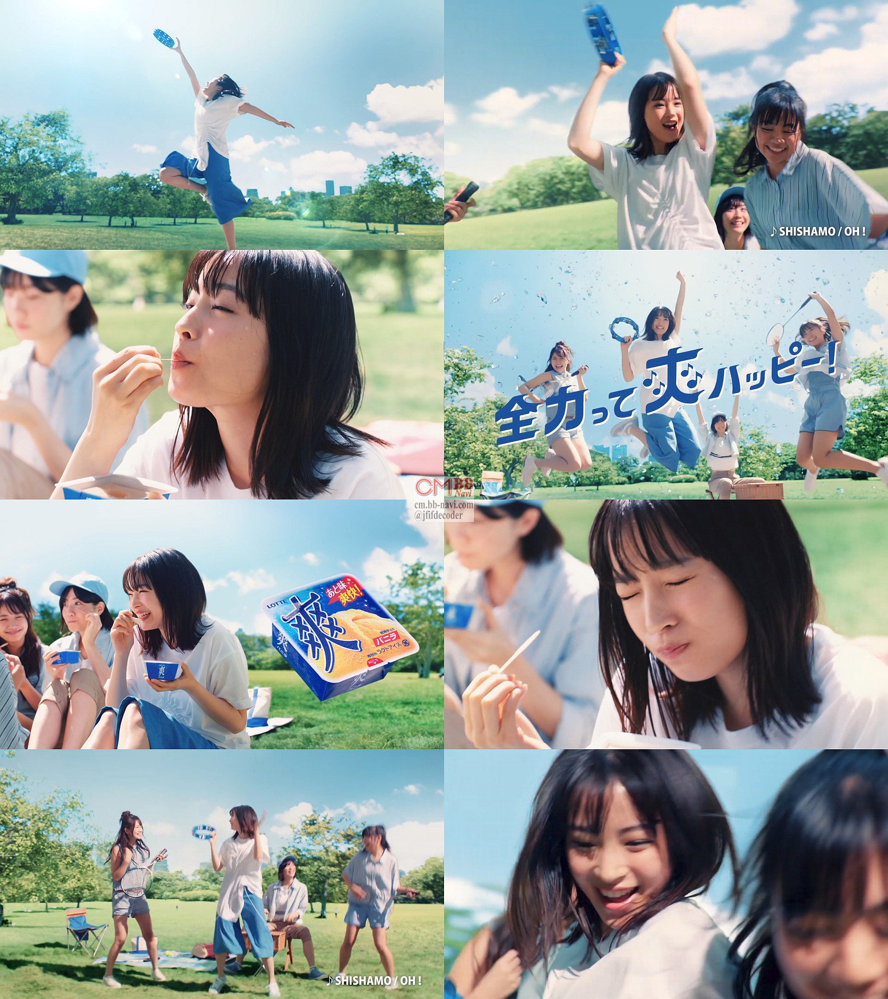 青いタンバリンを手にした女優の広瀬すずさんが女友達と一緒に青い芝生の上で全力でエアバンドをして「全力って、爽ハッピー(ソウハッピー)」とジャンプし、アイス爽を食べて最後に「一緒に合奏しよ」と言う、ロッテ アイス 爽のCMです。