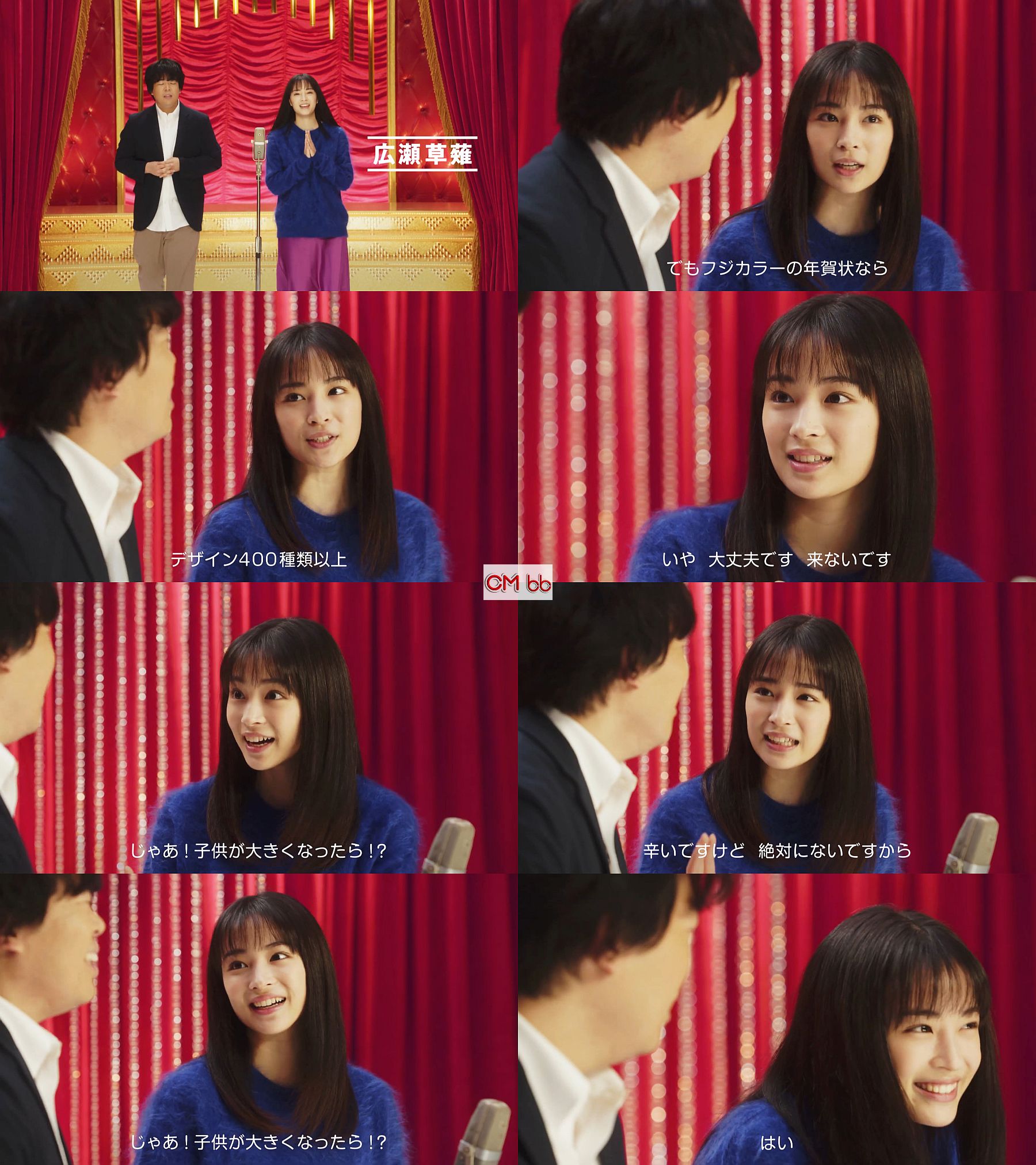 女優の広瀬すずさんとお笑いコンビ宮下草薙の草薙航基さんが漫才をする富士フイルム フジカラー写真年賀状のウェブCM フルバージョン2分47秒。