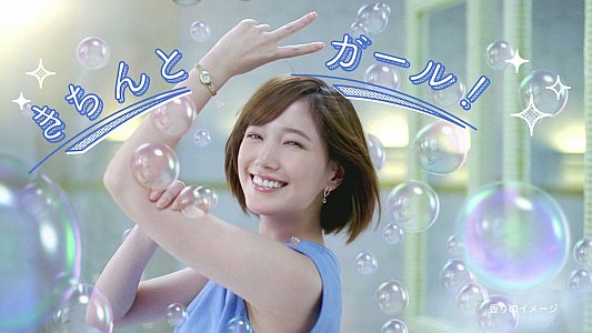 袖の無いブルー系の服を着た本田翼さんが「ガンバる私はお仕事ガール♪ 人前汗ベタ だらしなガール?」とラップをし、さらさらパウダーシートで汗をさっと拭いて、ピースサインで「きちんとガール」になって人に会う、花王 さらさらパウダーシート のCMです。
