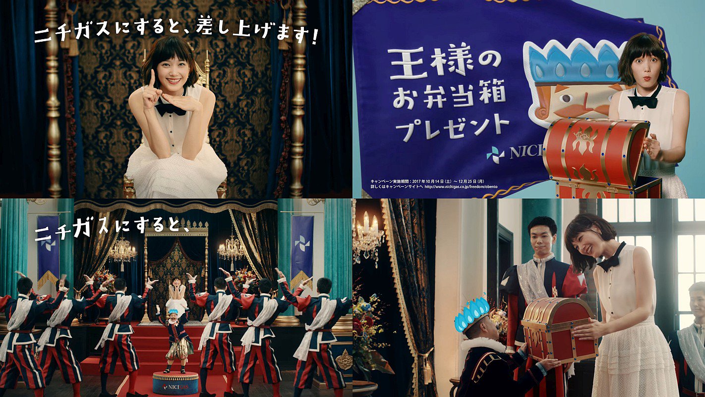 今度は本田翼さんが、ニチガス・二・スルーノ三世役の出川哲朗さんの王国の宮殿にやってきて、粗品を用意しましたと大きな宝箱のような王様のお弁当箱を渡され、本田翼さんが「くるしゅうない」と受け取る、日本瓦斯 ニチガスのCMです。