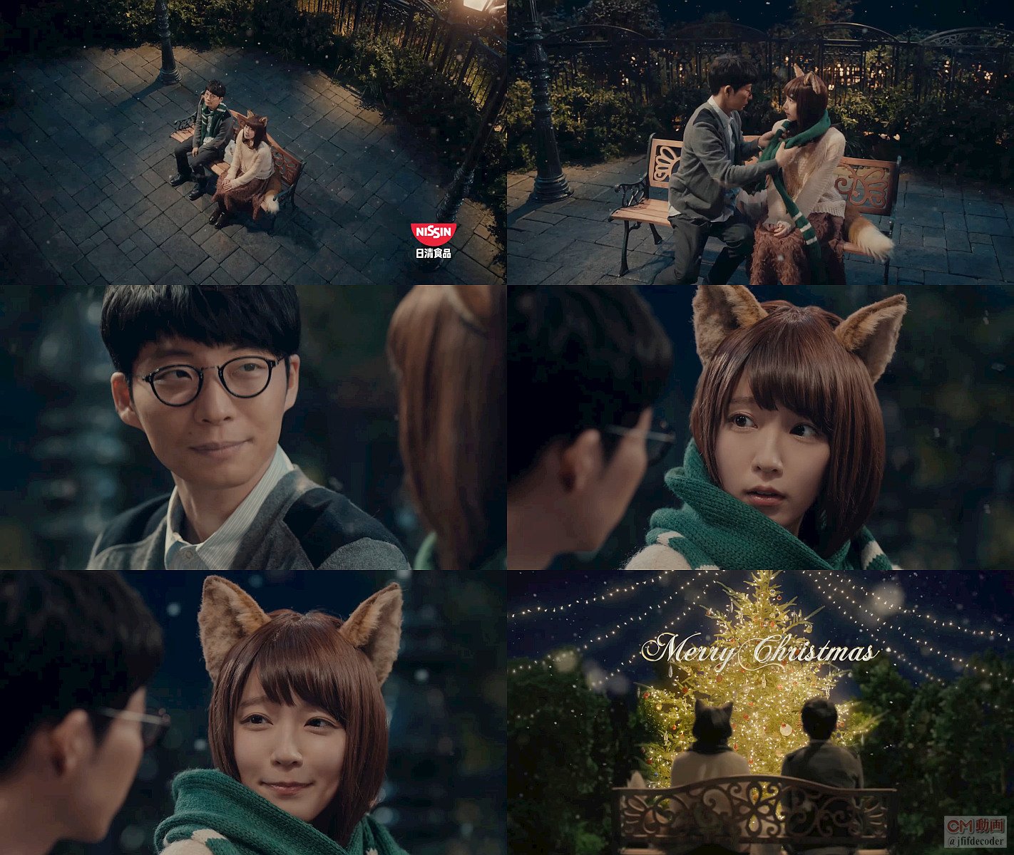 雪が降る夜の公園のベンチに座った俳優の星野源さんに、隣に座ったどんぎつね役の女優の吉岡里帆さんが「寒くないんですか?」と聞くと、「寒いです」「でも、少し体が冷えたほうが、どん兵衛も美味しいし」と言って、自分の首に巻いていた手編みのマフラーを、吉岡里帆さんの首に巻いて「なので、もう少し…」「付き合って下さい」と言うと「ハイ」と返し、正面のクリマスツリーを二人で見ながら「キレイ」と言う、日清のどん兵衛のCM動画です。