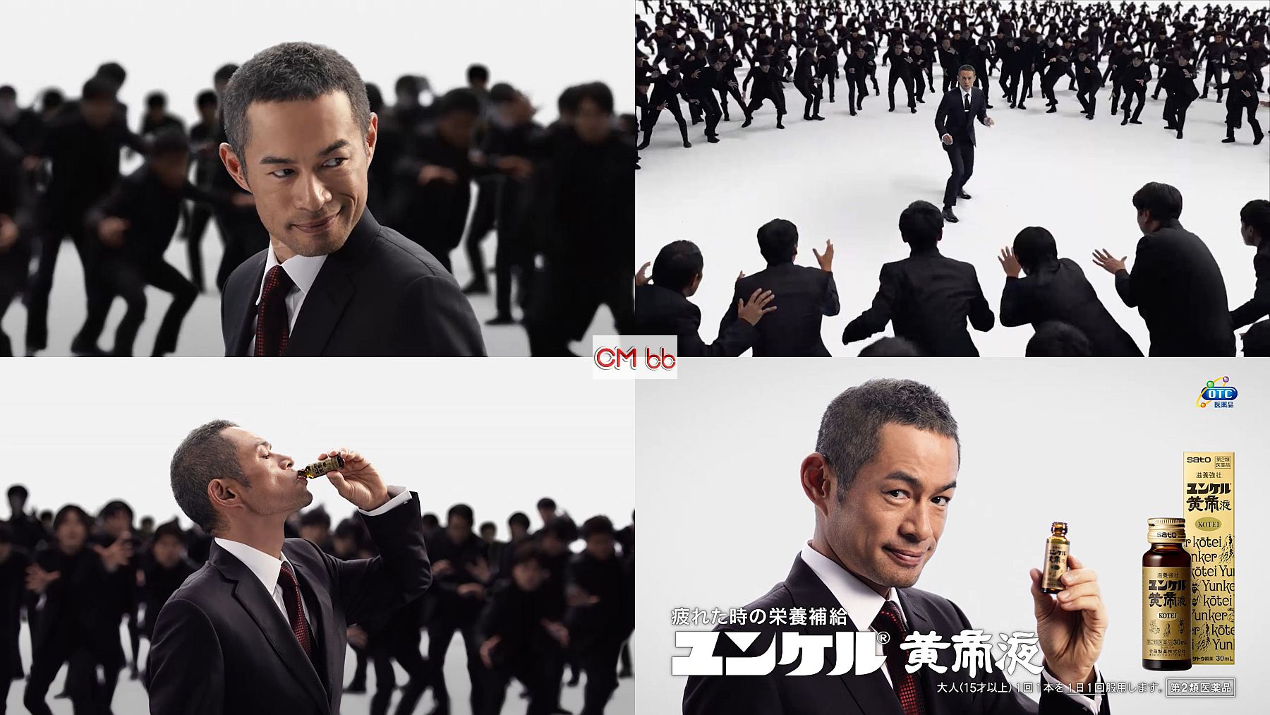 スーツ姿のイチローさんが、黒づくめの集団に取り囲まれ「日々追いかけてくる。様々な疲れ」と語り、胸元からユンケル黄帝液を取り出して飲み「疲れに立ち向かう、力を持とう」と語り、集団が去るCMです。