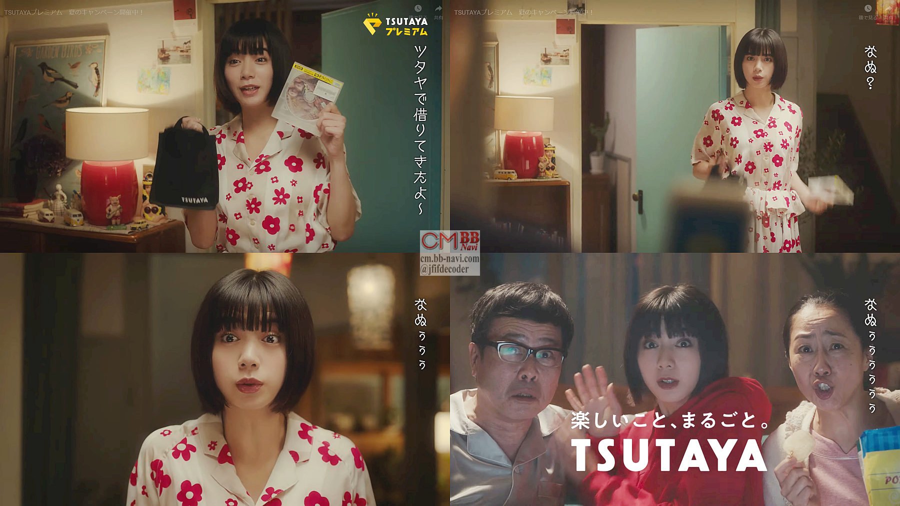 「ツタヤで借りてきたよ」とDVDを手に帰宅した娘役の女優の池田エライザさんに、父親の男性が「それ、スマホで見た」と言うので「なぬ?」 母役の女性が「お父さんも(ツタヤプレミアムに)入ったのよ」と言い、再び「なぬぅぅぅ」と驚き、ツタヤプレミアムの紹介映像の後、家族全員で借りてきたDVDを見て「このあとが凄いんだよ」言わないでよ」と会話し「なぬぅぅぅぅぅぅ」と驚きます。