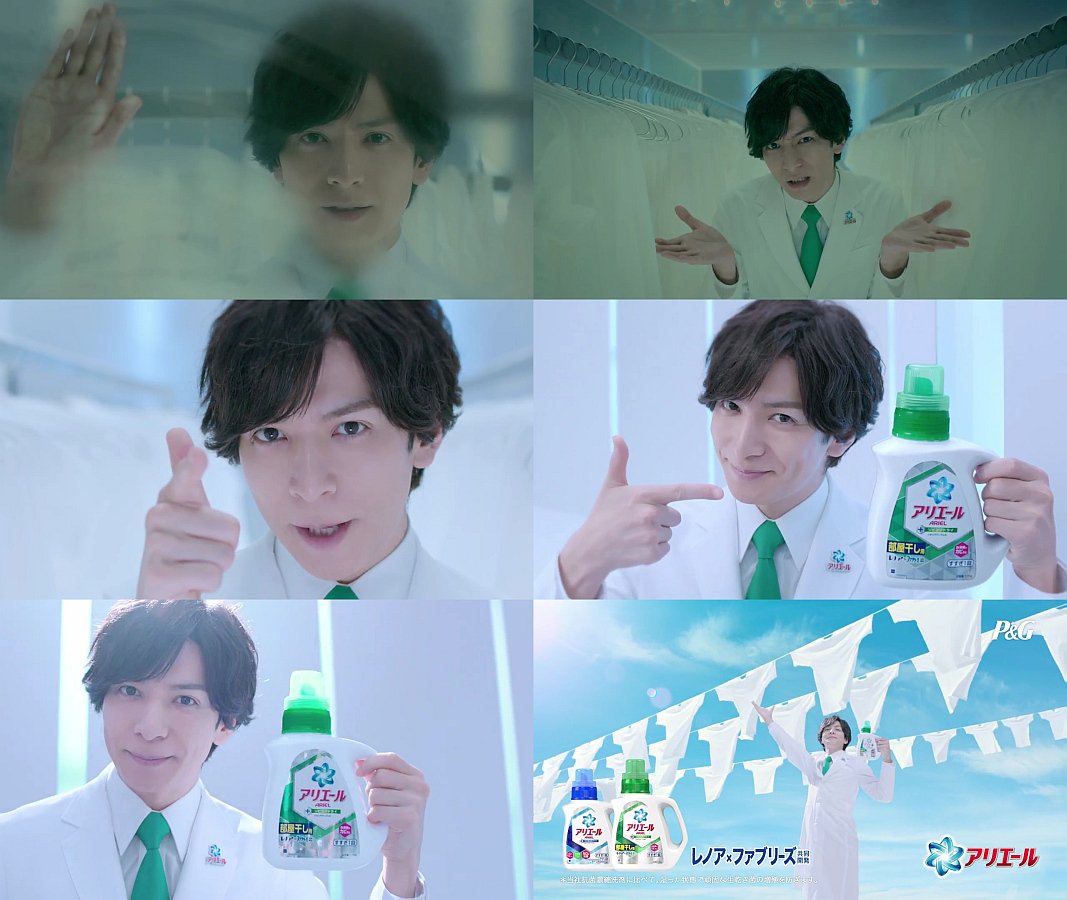 俳優の生田斗真さんが、白衣姿で登場し、「こんな最悪は部屋干しでも、緑のアリエールなら、臭わない」と、部屋干し実験室の最悪な環境でも、50倍抗菌で部屋干しでも臭わない緑色の部屋干し用アリエールを紹介する、CMです。