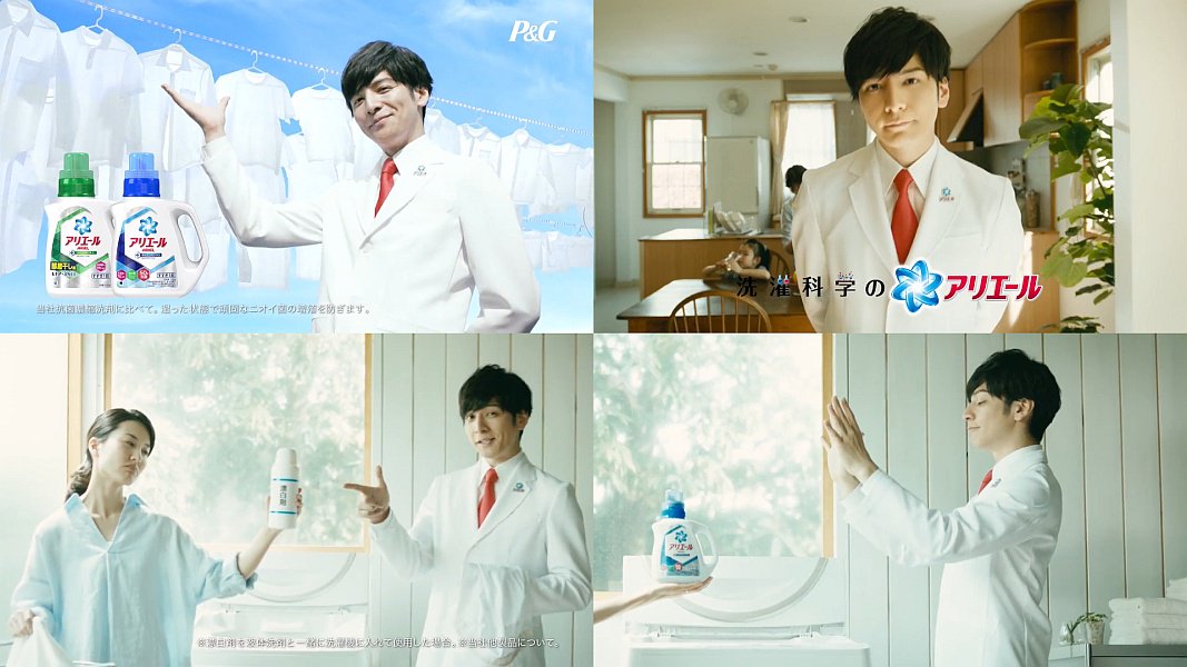 俳優の生田斗真さんが白衣姿で登場し、マネキンのように固まった野球少年やご主人の横を通り過ぎ、「汗と汚れがひどい、夏の洗濯物には、漂白剤が欠かせない?」と言って、主婦が持つ漂白剤をアリエールと取り換えて、シャツが真っ白になって、時間が動き出すアリエールのCMです。
