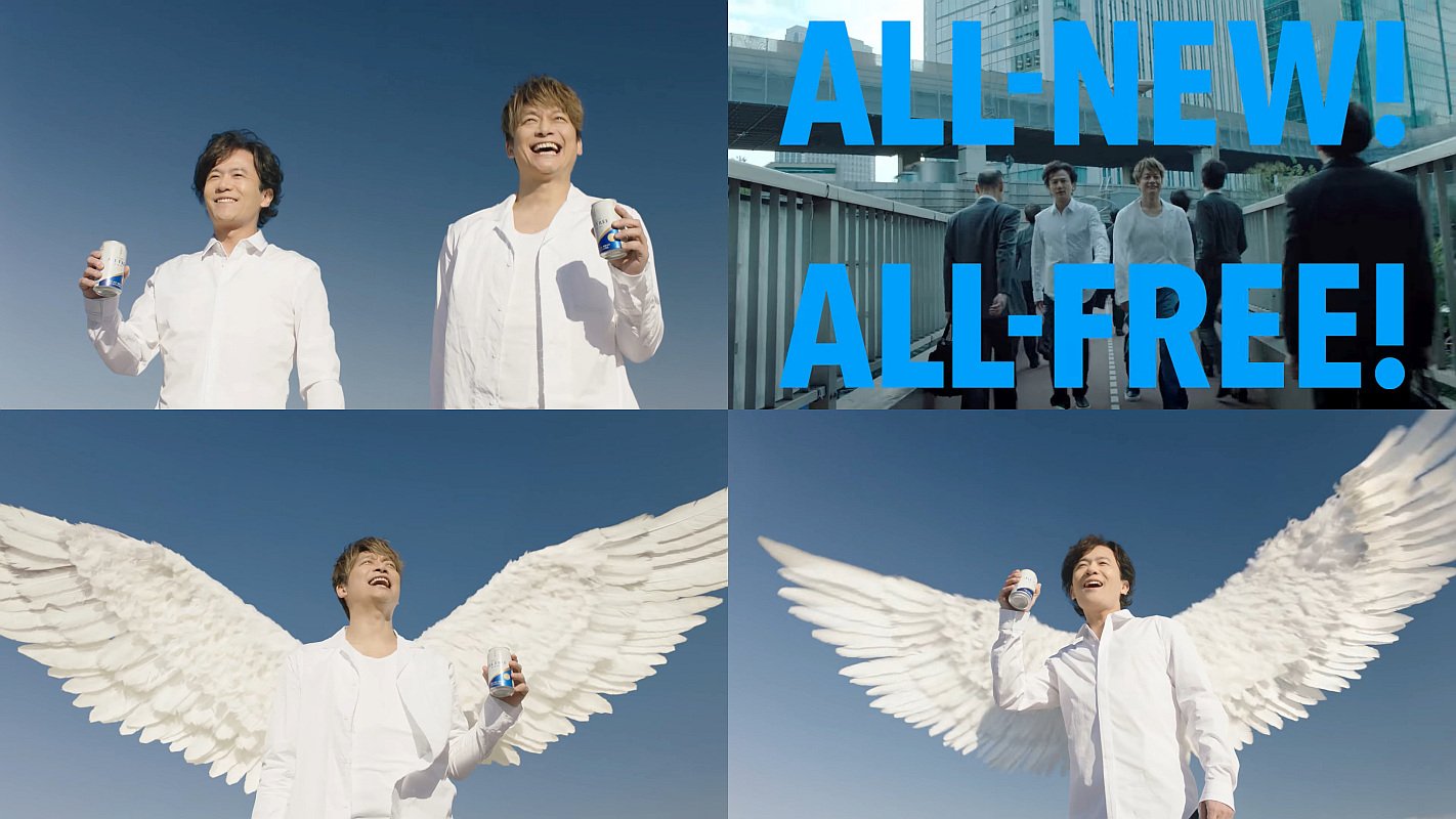雑踏を歩く、白いシャツを着た稲垣吾郎さんと香取慎吾さんが、階段を上り、オールフリーを一口飲み、街を見渡すと一瞬、背中から白い羽が生えて、「生きてるーー」と叫ぶ、サントリーの新オールフリーのCMです。