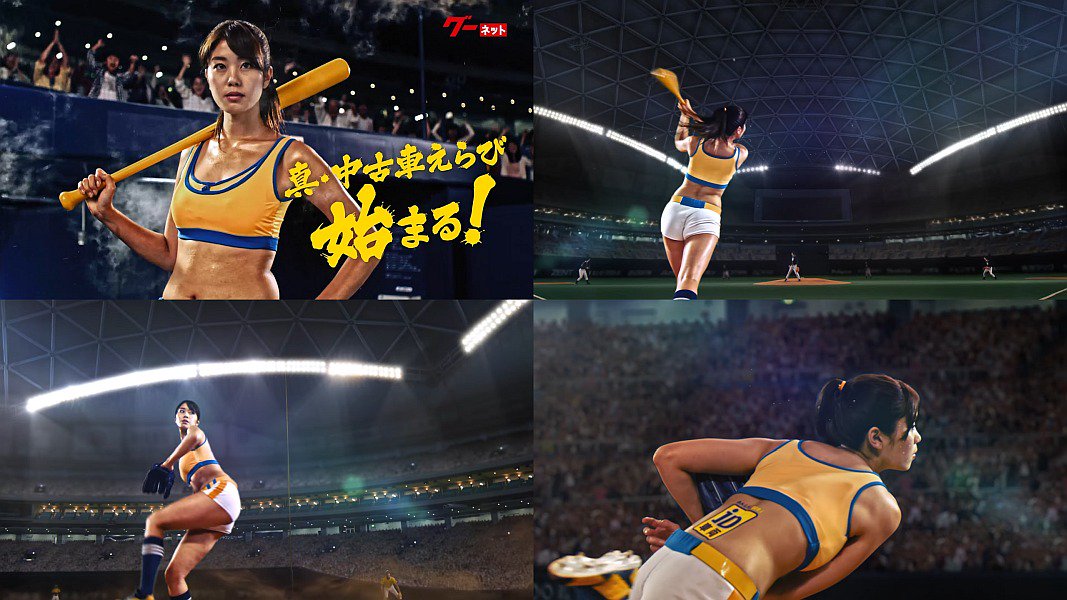 スポーツキャスターでグラビアアイドルで始球式で104Km/hの球を投げる稲村亜美さんが、バッターボックスに立ち、連続で球を見逃し、3球目の赤い球を打つと、グーネットのグーちゃんになる、グーネットのCMです。