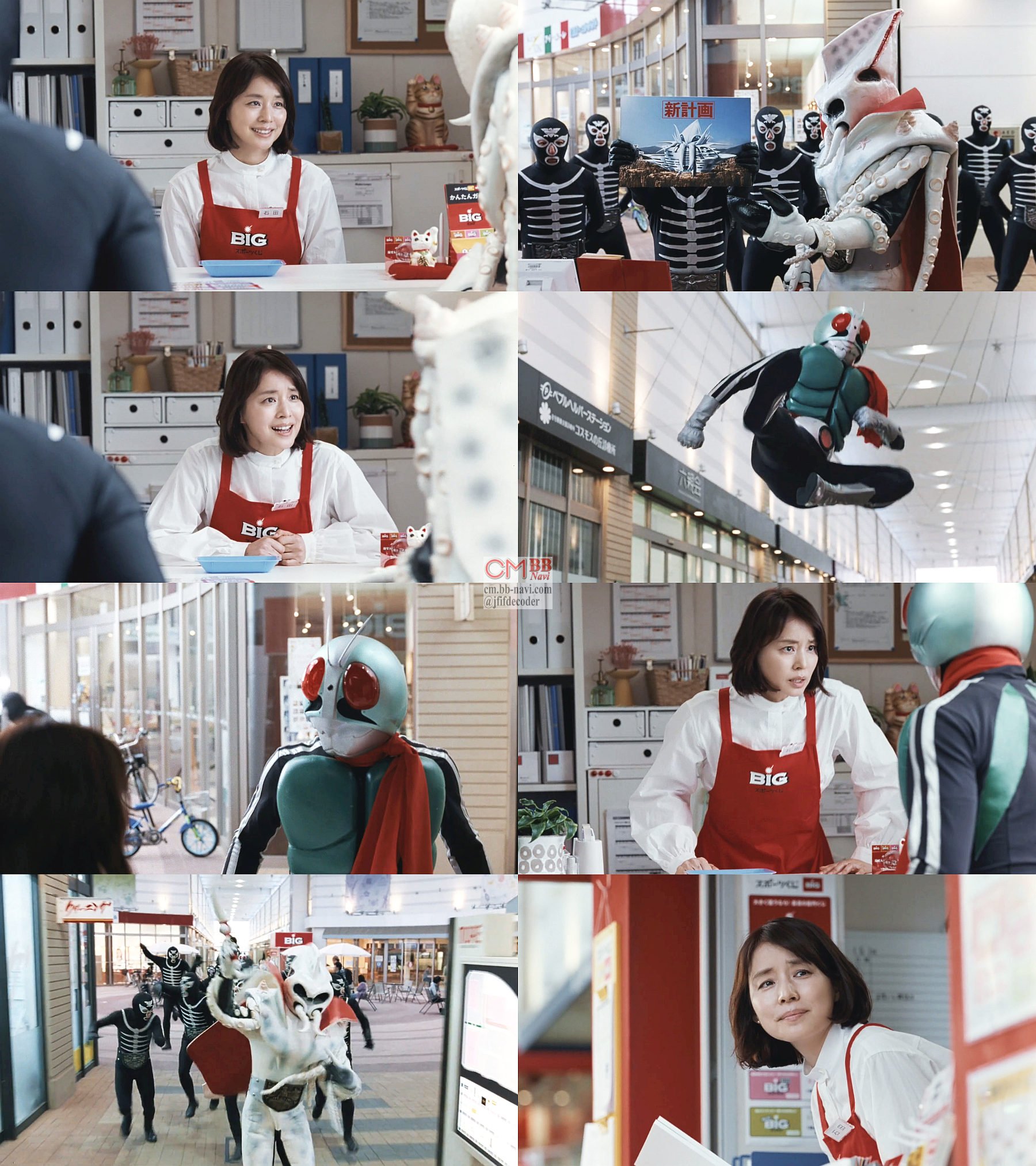 石田ゆり子さんが、ショッカーのイカデビルがボーナスBIGで「新しいアジトを建てる」と言うので「私も遊びに行ってもいいですか?」と会話が弾み、仮面ライダー1号がイカデビルをライダーキックで撃退する、ボーナスBIGのCM 30秒改訂版です。