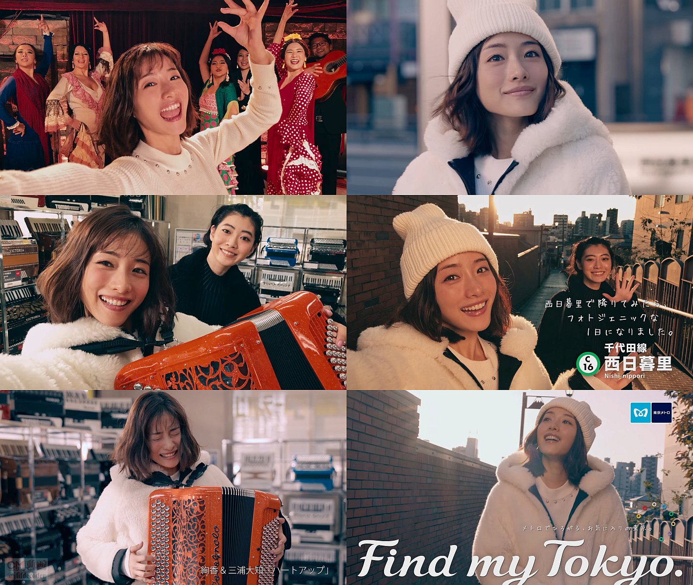 真っ白なニット帽をかぶった女優の石原さとみさんと安田聖愛さんが西日暮里にやってきて、妖怪の顔?のような妖怪いちご大福をスマホで写真に撮り、トンボ楽器製作所でアコーディオンを演奏しているショットをスマホで撮影し「西日暮里で降りてみたら、フォトジェニックな1日になりました」と言い、夜はスペイン料理とフラメンコのお店で「オーレ」とポーズして写真を撮る、東京メトロ Find my Tokyoの長編CMです。