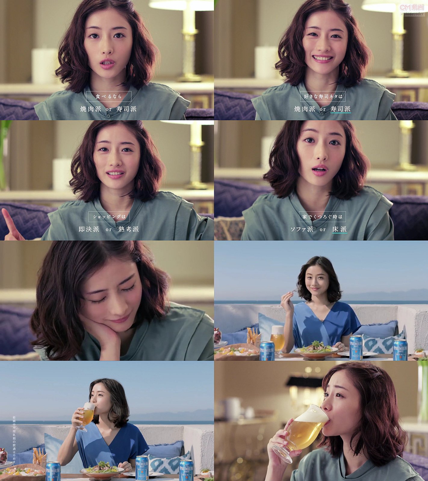 女優の石原さとみさんが、「焼肉派か寿司派か?」「かける派かかけない派か?」「食べる派か残す派か?」などなどの問いに即答し、最後にプレモルで乾杯し、私は香る派と言う、ウェブ限定のザ・プレミアム・モルツ 香るエールの長編CMです。