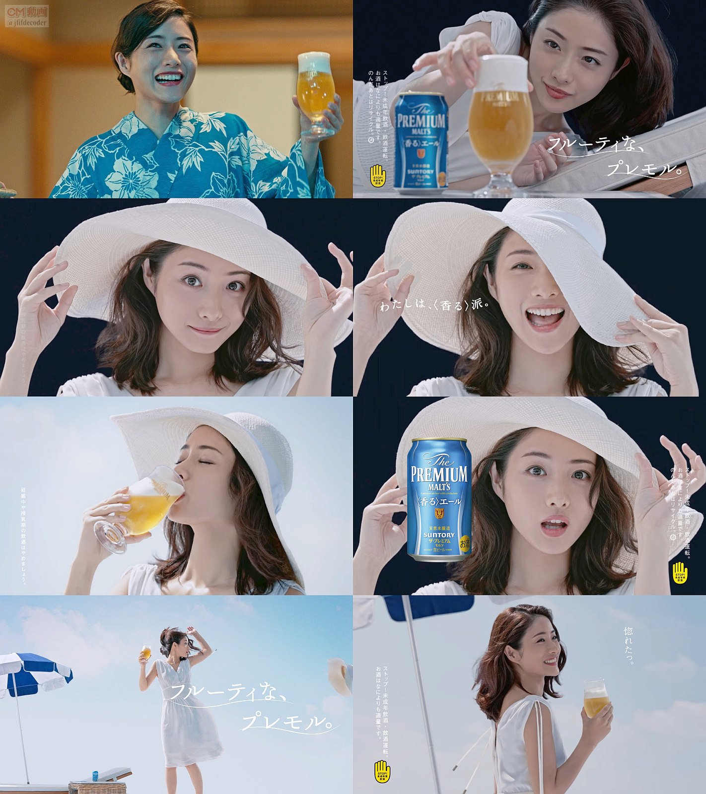 つばの大きな白い帽子に白のワンピース姿の女優の石原さとみさんが「フルーティなプレモル。香るエール」と語り、帽子が風に飛ばされる、短い6秒のCMです。