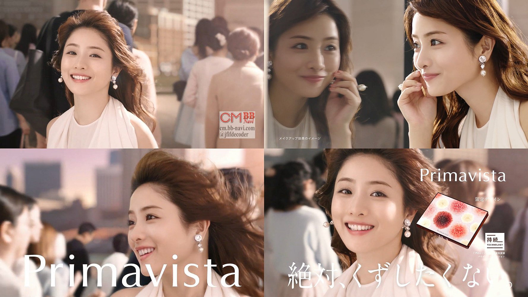 白いロングドレスに耳元にパール風のイヤリングをした着た女優の石原さとみさんが、『プリマならどんなに寄っても毛穴レス』『時間が経っても、毛穴レスの肌、続く』の女性ナレーションと共に、人波の中を笑顔で駆け抜けていき、最後に『絶対、くずしたくない』と、こちらを向いて微笑みます。