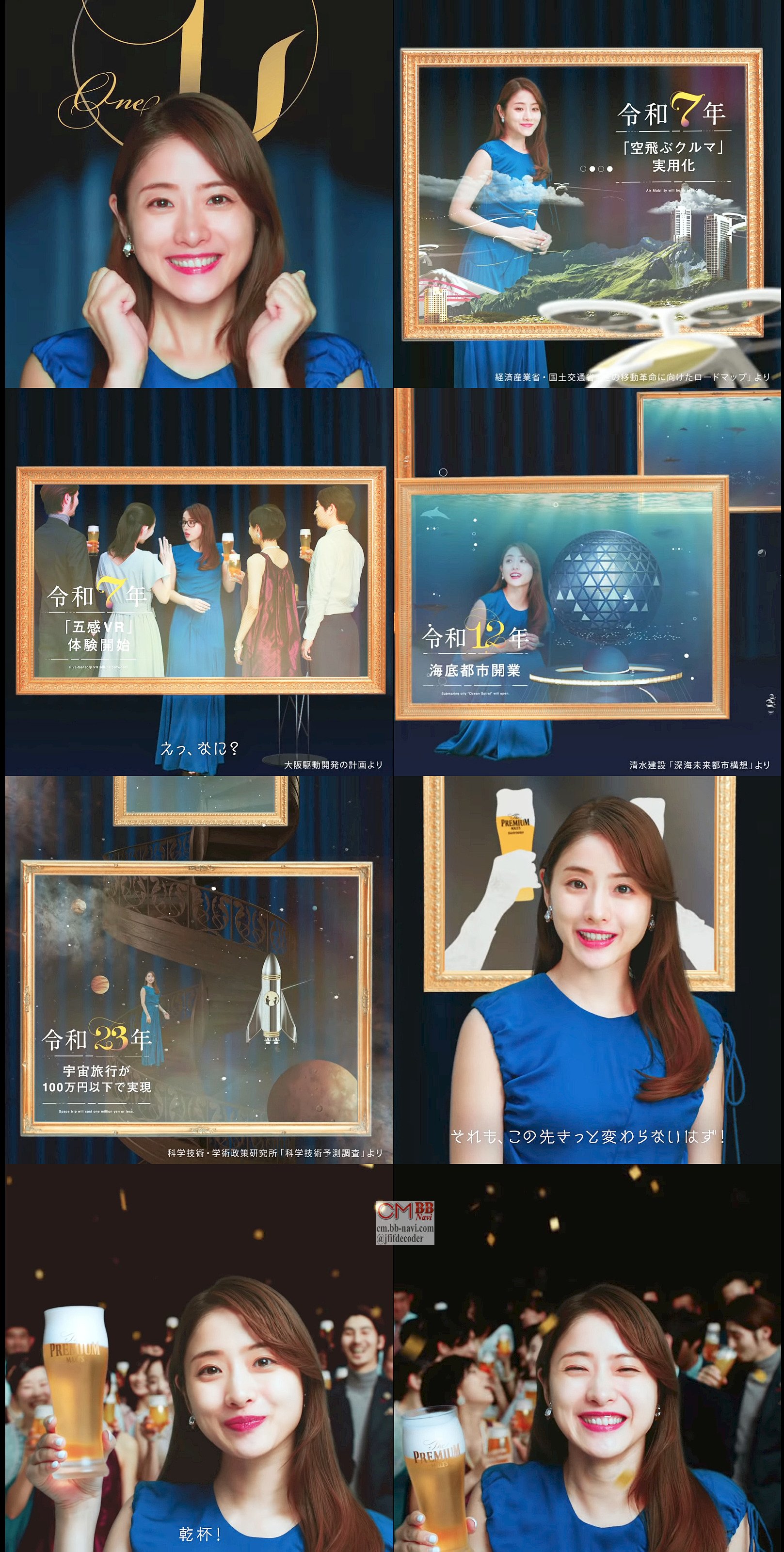 青いドレスを着た石原さとみさんが、カウントダウンと共に令和元年の幕開けに続き、「令和7年人や物を乗せた空飛ぶ車が実用化する」「令和7年五感でVRが体験できるようになる」「令和12年海底都市がオープンする」「令和23年宇宙旅行が100万円以下で実現する」と、令和の予想未来を紹介し、最後はププレミアムモルツで乾杯をする、長編ウェブCMです。