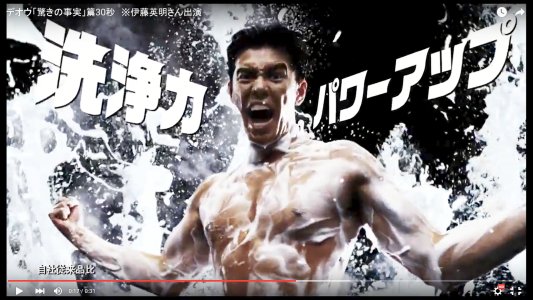 俳優の伊藤英明さんが白衣にメガネ姿で登場し、洗濯洗剤のCMでもするかのように「事実、男の臭いは落ちにくい」と紹介した直後、いつものように上半身裸で「デオウ」と目を剥いて登場し、過去このシリーズで最大級の濃さで、「洗浄力、パワーアップ」と吼える、デオウのCMです。