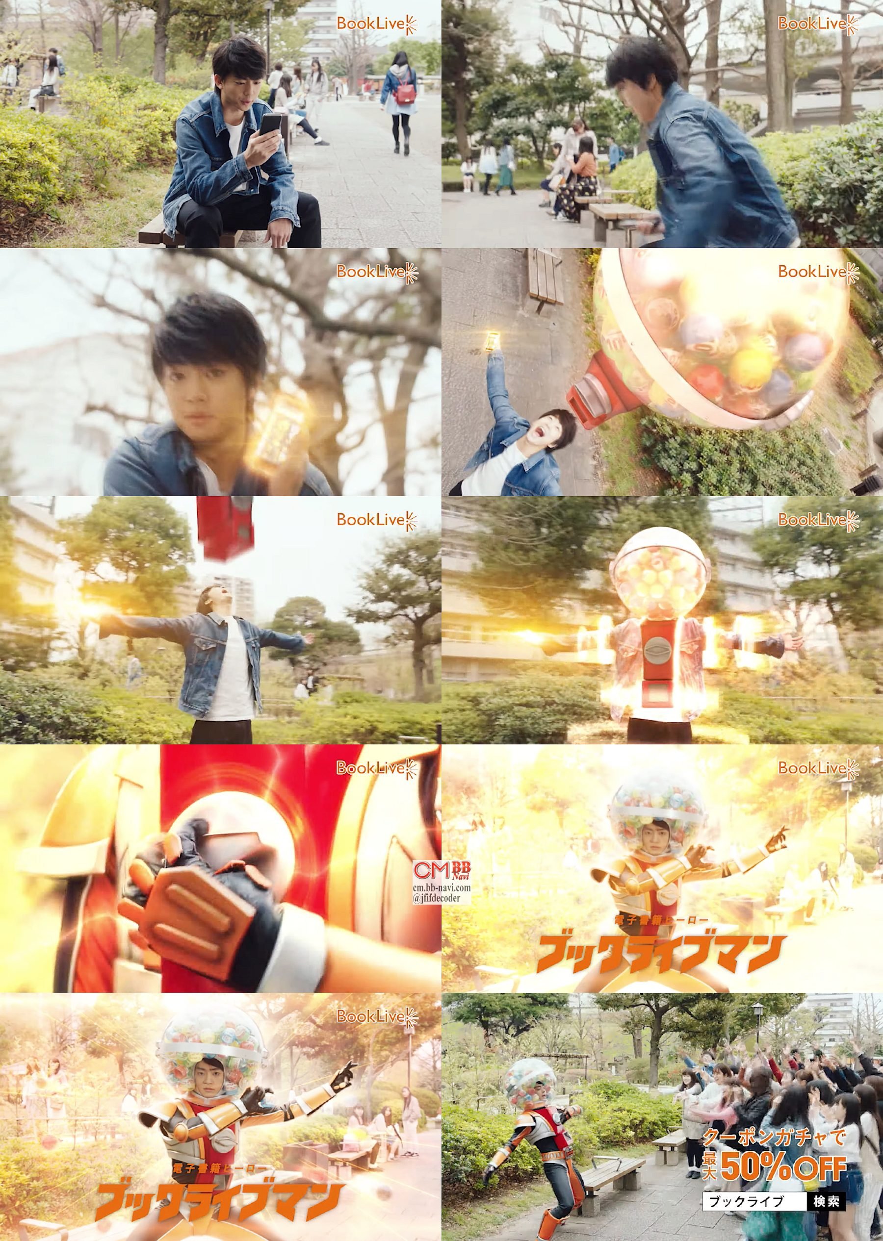俳優の伊藤健太郎さんが、公園のベンチでスマホを見ながら「すべての人にお得に漫画を読んでもらいたい」と言って、「変身」と光るスマホで変身ポーズをし、「クーポンガチャで、マンガ好きを救うヒーロー」と言うと、頭上から大きなガチャが下りてきて合体し、「その名も、ブックライブマン」と変身してキメポーズをし、胸からガチャをポンポンと出して「キャーキャー」言う女子達に配ります。