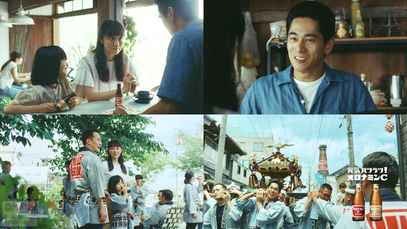 俳優の永山絢斗さんのカフェで、常連客の伊藤歩さんと娘が、永山絢斗さんに夏祭りの神輿の担ぎ手募集のパンフを見せて「絶対似合ってる」「モテるモテる」と言われ、応募して「みたいなハンパな気持ちで来る奴は俺は嫌いだ。あんた、違うよな」と言われ、胸を張って「全く違います」と答えてしまう、オロナミンCのCM 30秒版です。