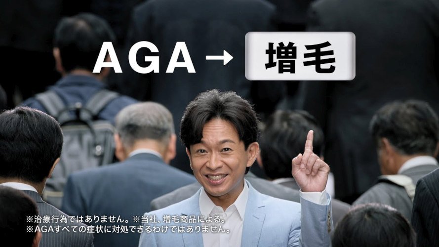 通勤するサラリーマンの中で、水色のジャケット姿のTOKIOの城島茂さんが「AGAには、増毛という提案があります」と登場し、マープ コントロール システムの紹介がされ、最後は「増やしたいのは笑顔です」と言って、一緒に石段を駆け上がるアートネイチャーのCM 30秒版です。