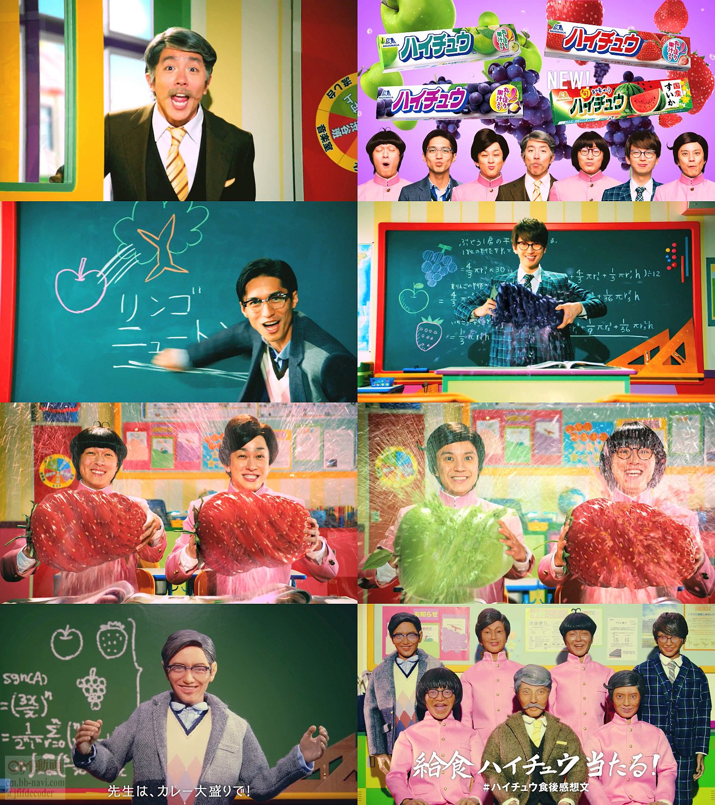 関ジャニ∞のメンバーが、ハイ中学校の生徒と先生になって、数学の授業中に村上校長が「8月12日はハイチュウの日やで」「8月12日はハイチュウの日やで」と言ってプレゼントキャンペーンを告知するCMです。