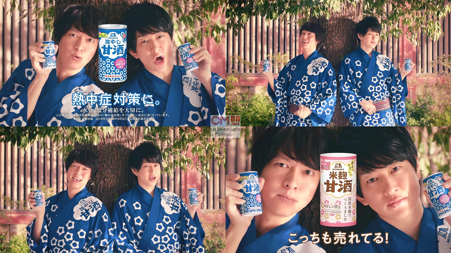 冷やし甘酒デザイン浴衣姿の関ジャニ∞の横山裕さんと丸山隆平さんが木にもたれながら「冷やし甘酒〜 森永♪」「冷やし甘酒〜 森永♪」「冷やし甘酒〜 と言ったら日本で一番売れてる甘酒森永の甘酒♪」と演歌調に歌って甘酒ブラザーズになる、森永 冷やし甘酒のCMです。