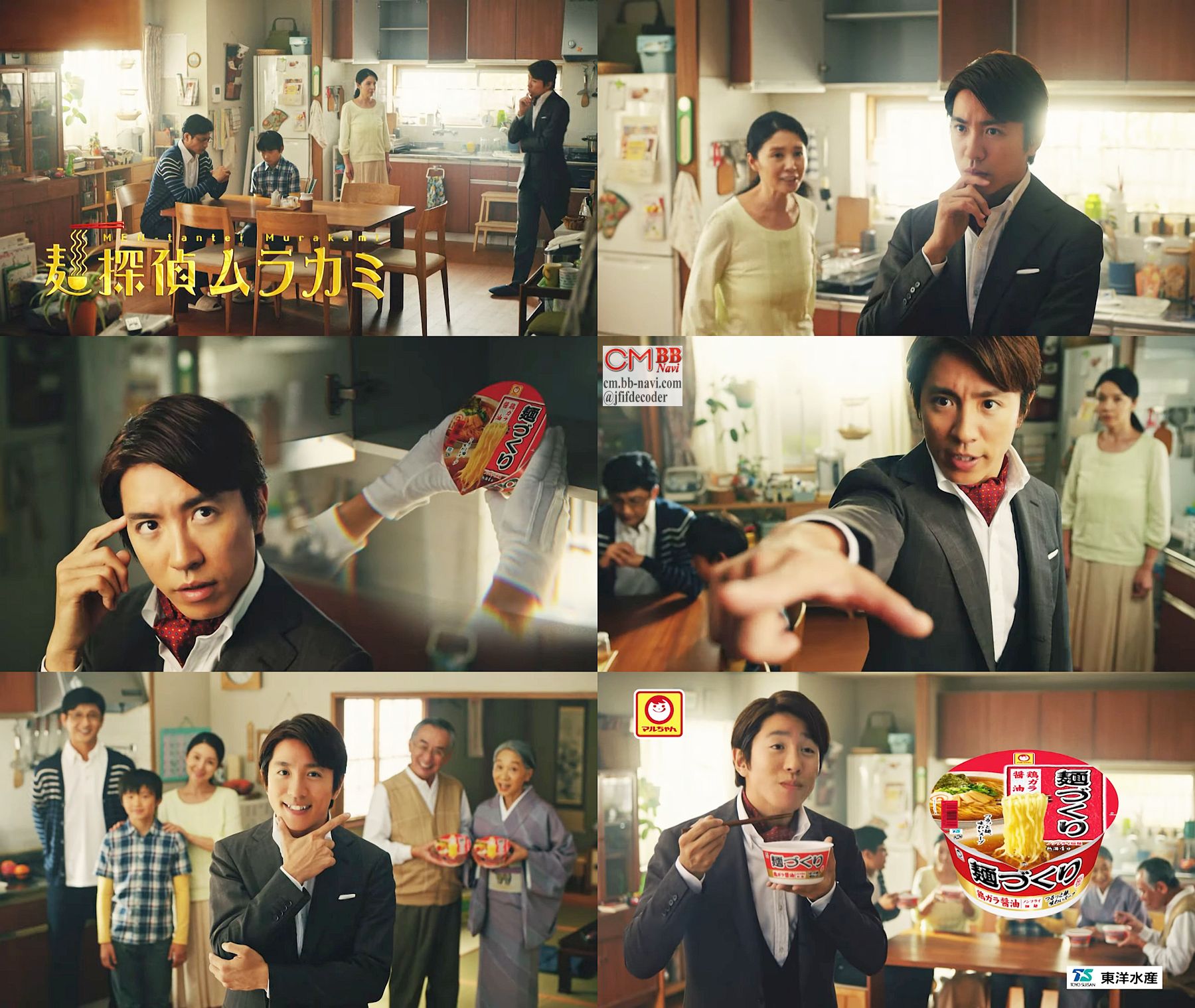 「つまり麺づくりが消えた」との依頼を受けた麺探偵ムラカミ役の関ジャニ∞の村上信五さんが、「やったのは… おじいちゃんだ」「あ、おばあちゃんも」と、名推理?で、あっさり犯人を言いあてて解決してしまう、東洋水産 マルちゃん麺づくりのCMです。