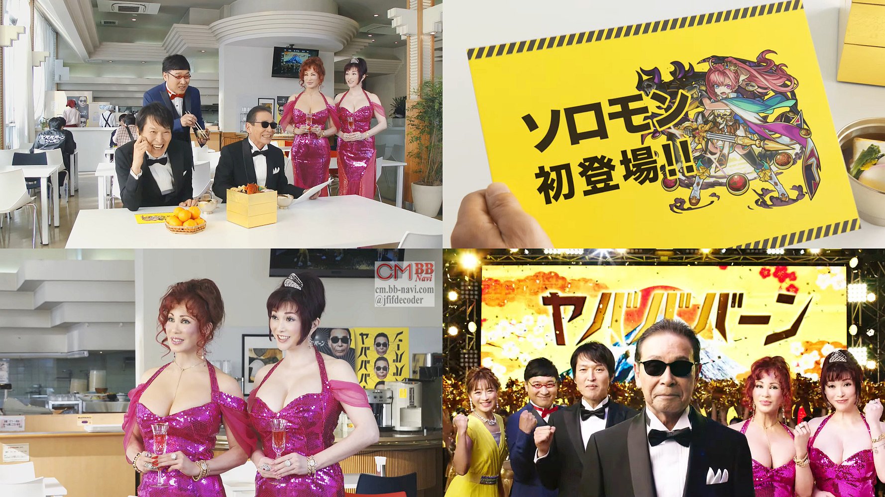 タキシードを着たタレントのタモリさんと千原ジュニアさんが、カードに”ソロモン登場”と書かれていているのを見て、「新キャラ… フェロモン」と間違うので、後ろの山里亮太さんが「ソロモンです」と訂正するので、「相変わらず嫌な声だよね」「その髪型イケてんの?」とタモリさんにいじられて、またボケるので、叶姉妹が「なんでもよろしいんじゃないですか?」と言うので、タモリさんが「やっぱ、フェロモンだ」と笑う、モンストのCMです。