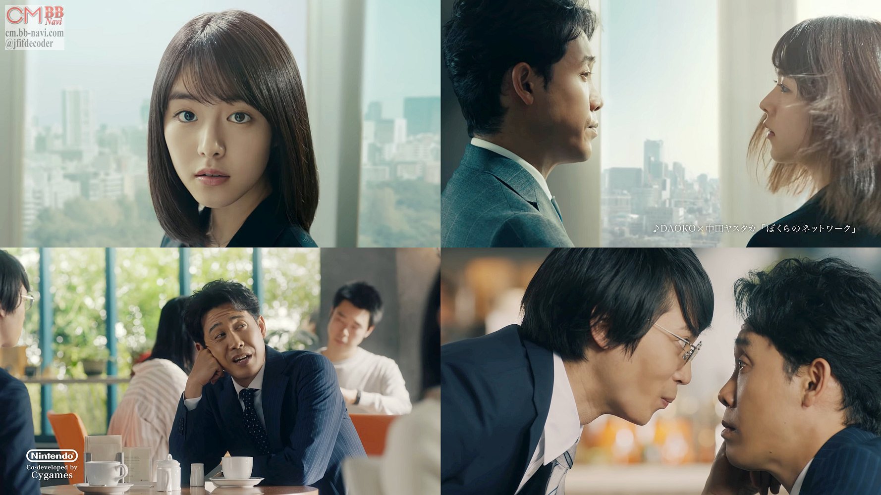 サラリーマン役の俳優の大泉洋さんが窓から外を眺めながら「ここはもうおとなしくさ…」と言うと、後輩OL役の女優の唐田えりかさんがスローモーションで振り向き「先輩、冒険してますか?」と問いかける、任天堂とCygamesのスマートフォン向けアクションRPG ドラガリアロストのCMです。