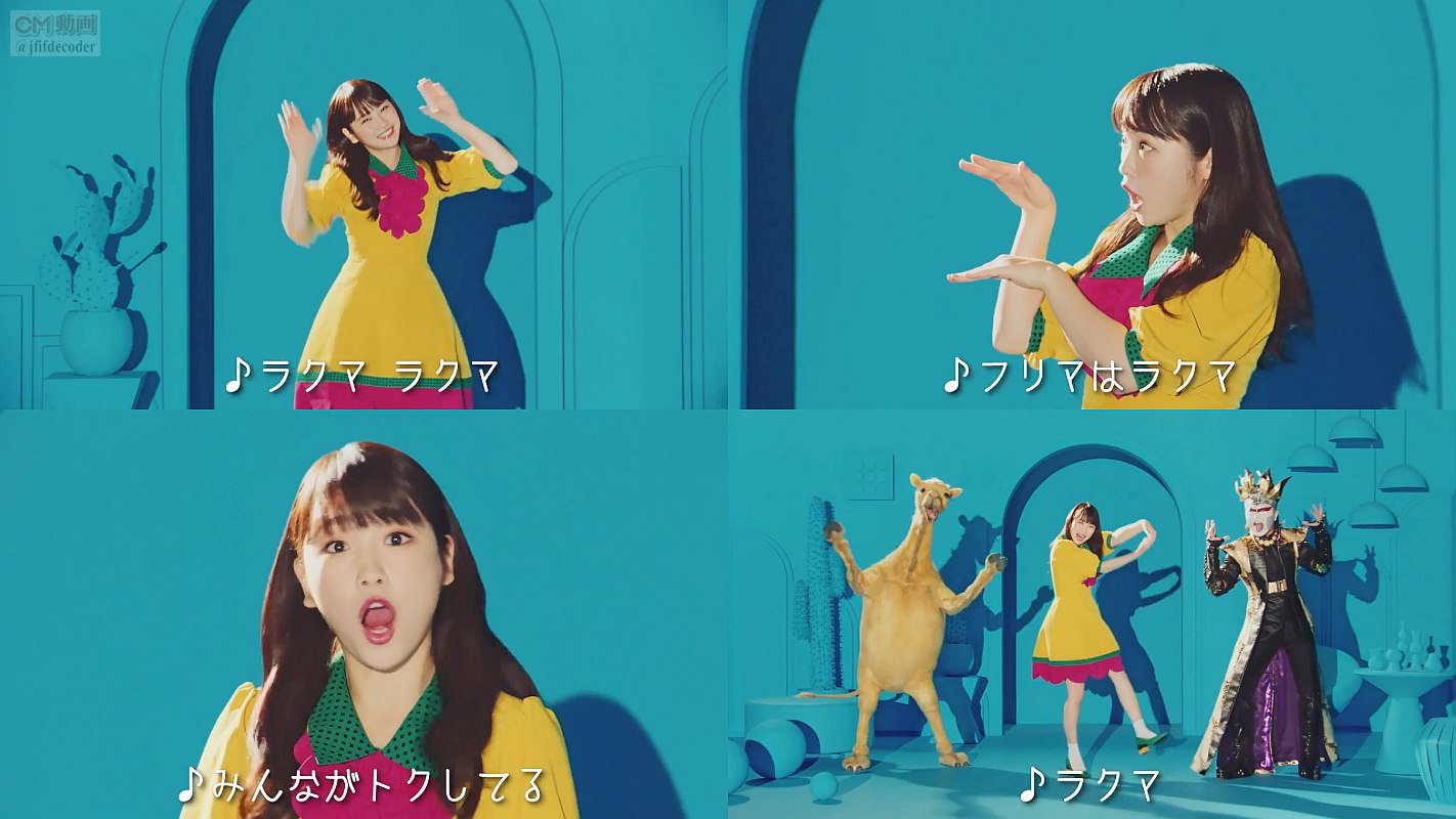 黄色いワンピース姿の女優の川栄李奈さんが「ラクマ ラクマ フリマはラクマ♪」と歌うと、変な着ぐるみラクダもスマホでラクマしてて、デーモン小暮の悪魔もスマホでラクマしてて「みんなが得してる♪」と歌うCM 字幕入りバージョンです。
