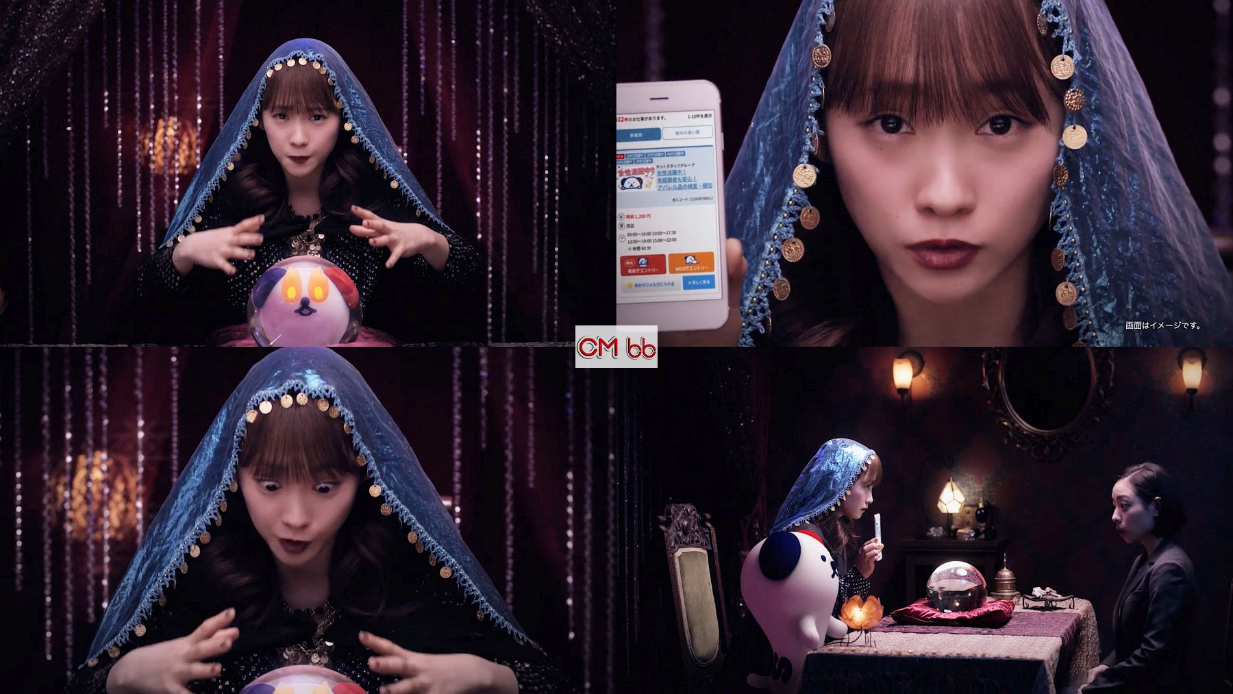 占い師役の女優の川栄李奈さんに、女性が「今の仕事変えたくて」と聞くと、「そんなあなたを〜 ホット犬(けん)」と水晶に犬が現れ、「派遣はホットスタッフホットスタッフ」と占い結果を言うと、ホット犬が登場し女性が驚く ホットスタッフのCMです。