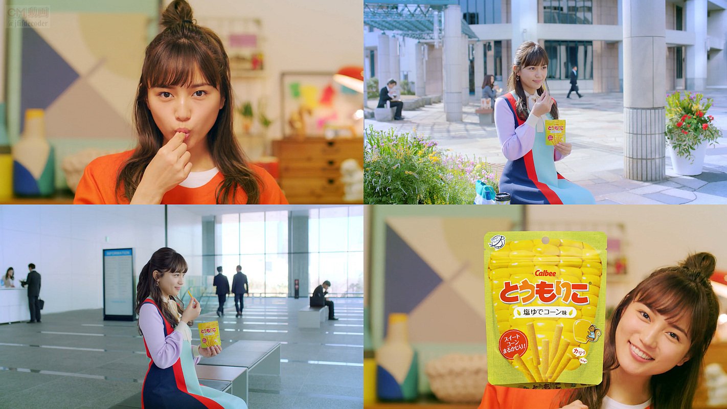 女優の川口春奈さんが、駅のホームやオフィスのデスクや広場のベンチや自宅のソファなどでとうもろこしで作ったじゃがりこのとうもりこを「どうにもこうにもとうもりこ」と食べて、「じゃがりこじゃないよ、とうもりこ」と言うCMです。
