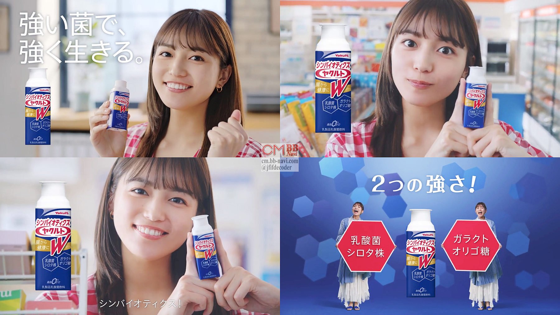 川口春奈さんが二人登場し「乳酸菌シロタ株」「ガラクトオリゴ糖」「2つの強さで、シンバイオティクス わー」と言う、短い6秒のシンバイオティクス ヤクルトWのCMです。