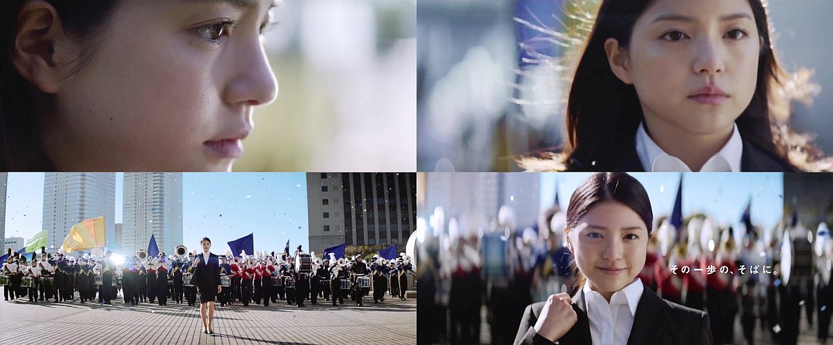 就活生役のリクルート服姿の女優の川島海荷さんが、公園のベンチで意を決して立ち上がると、マーチングバンドが演奏を始めて、川島海荷さんに後に続いて行進し、面接会場までずっと応援し続けてついてくる、リクルート リクナビ2018のCMです。