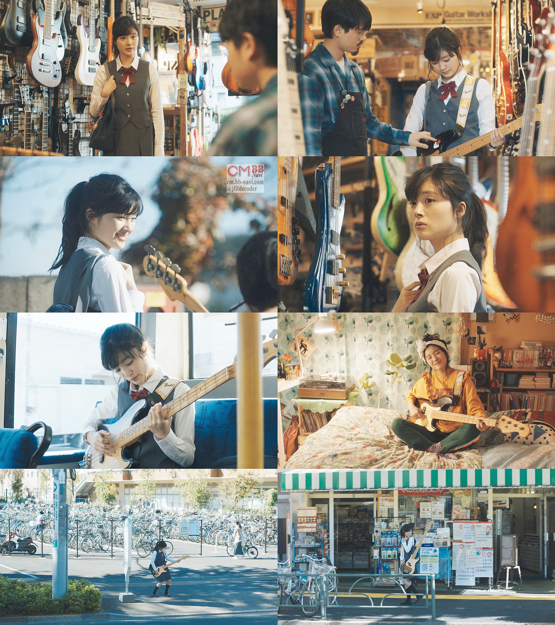 何気なく楽器屋に入った、女子高生役の川床明日香さんが男子がベースを弾いてるのに見惚れて、店主役のハマ・オカモトさんから「ベース?弾いてみる?」と聞かれ「一番安いのってどれですか?」と聞くと、「うーん。じゃあ1000円。俺のおさがり」とタダ同然でベースを売って貰って、自宅ベッドの上で練習をしてるCM 1分版です。