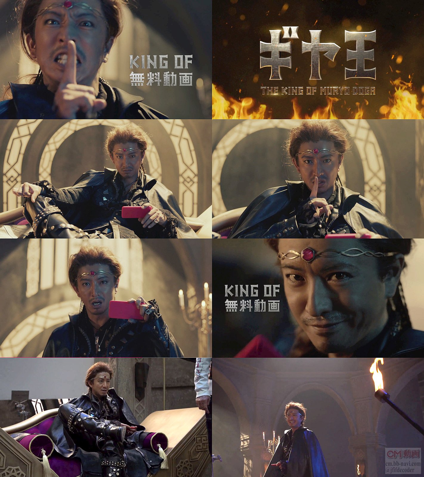 GYAO公式の紹介では、ギヤ王 登場篇は”中世を思わせる古城の長い廻廊。颯爽と歩く影を追い、家臣と思われる男性たちが忙しなく歩いてます。「お待ち下さい」の声を気にする素振りもなく、人影は歩き続けます。玉座の間に入り、ようやく呼びかけに応えて振り向いたのは、国と民、そして無料動画をこよなく愛するKING OF 無料動画・ギヤ王。「動画見てから」の一言と微笑みを残しながら、再び玉座へ歩みを進めてしまうギヤ王なのでした。”
